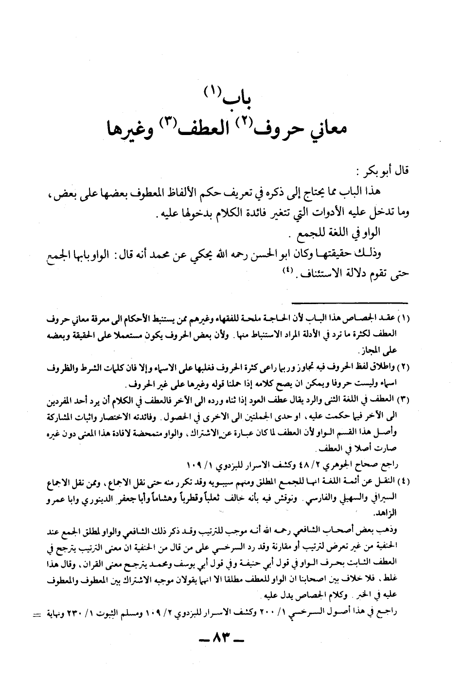 قَالَ أَبُو بَكْرٍ: هَذَا الْبَابُ مِمَّا يُحْتَاجُ إلَى ذِكْرِهِ فِي تَعْرِيفِ حُكْمِ الْأَلْفَاظِ الْمَعْطُوفِ بَعْضِهَا عَلَى بَعْضٍ، وَمَا تَدْخُلُ عَلَيْهِ الْأَدَوَاتُ الَّتِي تَتَغَيَّرُ فَائِدَةُ الْكَلَامِ بِدُخُولِهَا عَلَيْهِ. الْوَاوُ فِي اللُّغَةِ لِلْجَمْعِ. وَذَلِكَ حَقِيقَتُهَا وَكَانَ أَبُو الْحَسَنِ - رَحِمَهُ اللَّهُ - يَحْكِي عَنْ مُحَمَّدٍ أَنَّهُ قَالَ: الْوَاوُ بَابُهَا الْجَمْعُ حَتَّى تَقُومَ دَلَالَةُ الِاسْتِئْنَافِ.