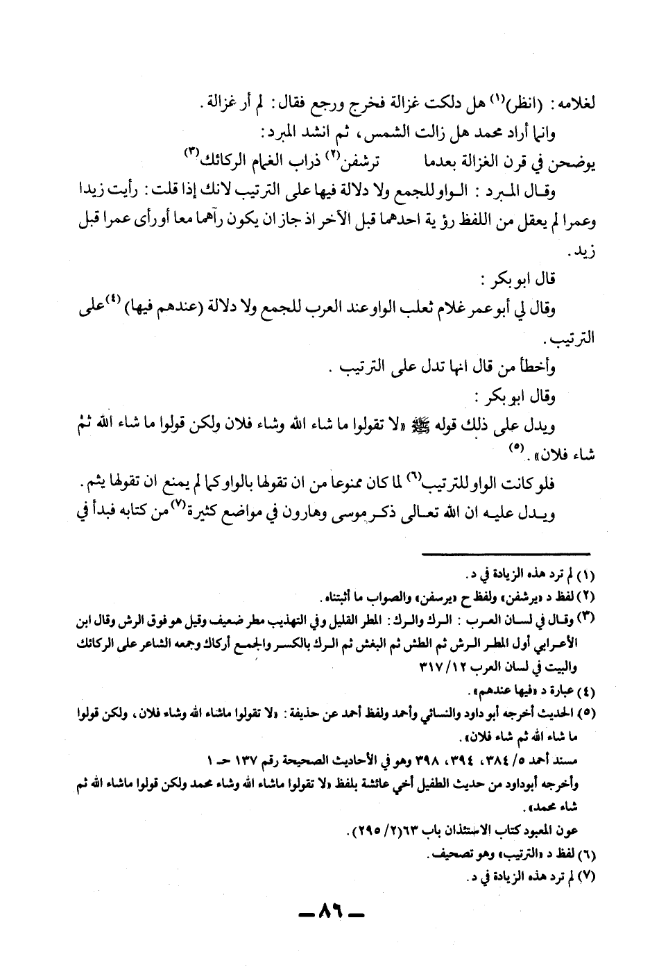 قَالَ أَبُو بَكْرٍ: وَقَالَ لِي أَبُو عُمَرَ غُلَامُ ثَعْلَبٍ الْوَاوُ عِنْدَ الْعَرَبِ لِلْجَمْعِ وَلَا دَلَالَةَ (عِنْدَهُمْ فِيهَا) عَلَى التَّرْتِيبِ. وَأَخْطَأَ مَنْ قَالَ إنَّهَا تَدُلُّ عَلَى التَّرْتِيبِ. وَقَالَ أَبُو بَكْرٍ: وَيَدُلُّ عَلَى ذَلِكَ قَوْلُهُ - صَلَّى اللَّهُ عَلَيْهِ وَسَلَّمَ - «لَا تَقُولُوا مَا شَاءَ اللَّهُ وَشَاءَ فُلَانٌ وَلَكِنْ قُولُوا مَا شَاءَ اللَّهُ ثُمَّ شَاءَ فُلَانٌ» . فَلَوْ كَانَتْ الْوَاوُ لِلتَّرْتِيبِ لَمَا كَانَ مَمْنُوعًا مِنْ أَنْ تَقُولَهَا بِالْوَاوِ كَمَا لَمْ يُمْنَعْ أَنْ تَقُولَهَا بِثُمَّ. وَيَدُلُّ عَلَيْهِ أَنَّ اللَّهَ تَعَالَى ذَكَرَ مُوسَى وَهَارُونُ فِي مَوَاضِعَ كَثِيرَةٍ مِنْ كِتَابِهِ فَبَدَأَ فِي