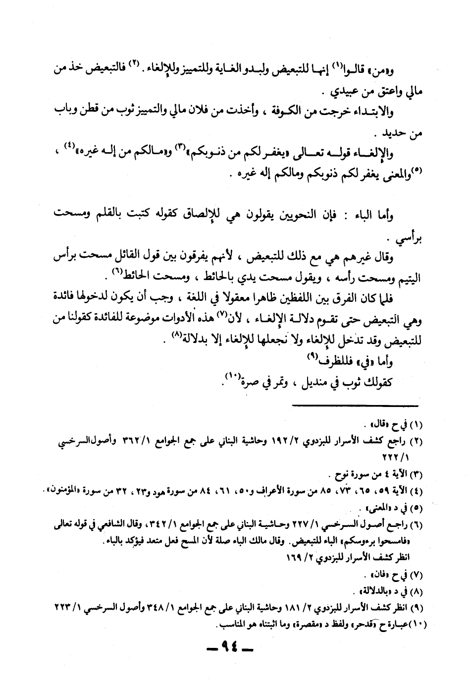 وَأَمَّا الْبَاءُ: فَإِنَّ النَّحْوِيِّينَ يَقُولُونَ هِيَ لِلْإِلْصَاقِ كَقَوْلِهِ كَتَبْت بِالْقَلَمِ وَمَسَحْت بِرَأْسِي. وَقَالَ غَيْرُهُمْ هِيَ مَعَ ذَلِكَ لِلتَّبْعِيضِ، لِأَنَّهُمْ يُفَرِّقُونَ بَيْنَ قَوْلِ الْقَائِلِ مَسَحْت بِرَأْسِ الْيَتِيمِ وَمَسَحْت رَأْسَهُ، وَيَقُولُ مَسَحْت يَدِي بِالْحَائِطِ، وَمَسَحْت الْحَائِطَ. فَلَمَّا كَانَ الْفَرْقُ بَيْنَ اللَّفْظَيْنِ ظَاهِرًا مَعْقُولًا فِي اللُّغَةِ، وَجَبَ أَنْ يَكُونَ لِدُخُولِهَا فَائِدَةٌ وَهِيَ التَّبْعِيضُ حَتَّى تَقُومَ دَلَالَةُ الْإِلْغَاءِ، لِأَنَّ هَذِهِ الْأَدَوَاتِ مَوْضُوعَةٌ لِلْفَائِدَةِ كَقَوْلِنَا مِنْ لِلتَّبْعِيضِ وَقَدْ تَدْخُلُ لِلْإِلْغَاءِ وَلَا نَجْعَلُهَا لِلْإِلْغَاءِ إلَّا بِدَلَالَةٍ. .
