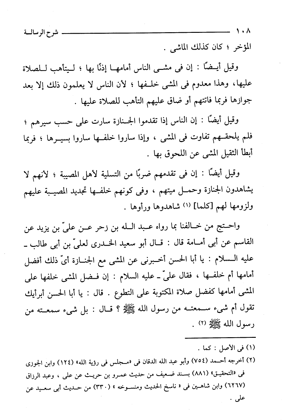 واحتج من خالفنا بما رواه عبد الله بن زحر عن علي بن يزيد عن القاسم عن أبي أمامة قال: قال أبو سعيد الخدري لعلى بن أبي طالب- عليه السلام: يا أبا الحسن أخبرني عن المشي مع الجنازة أي ذلك أفضل أمامها أم خلفها، فقال علي- عليه السلام: إن فضل المشي خلفها على المشي أمامها كفضل صلاة المكتوبة على التطوع. قال: يا أبا الحسن أبرأيك تقول أم شيء سمعته من رسول الله صلى الله عليه وسلم؟ قال: بل شيء سمعته من رسول الله صلى الله عليه وسلم.