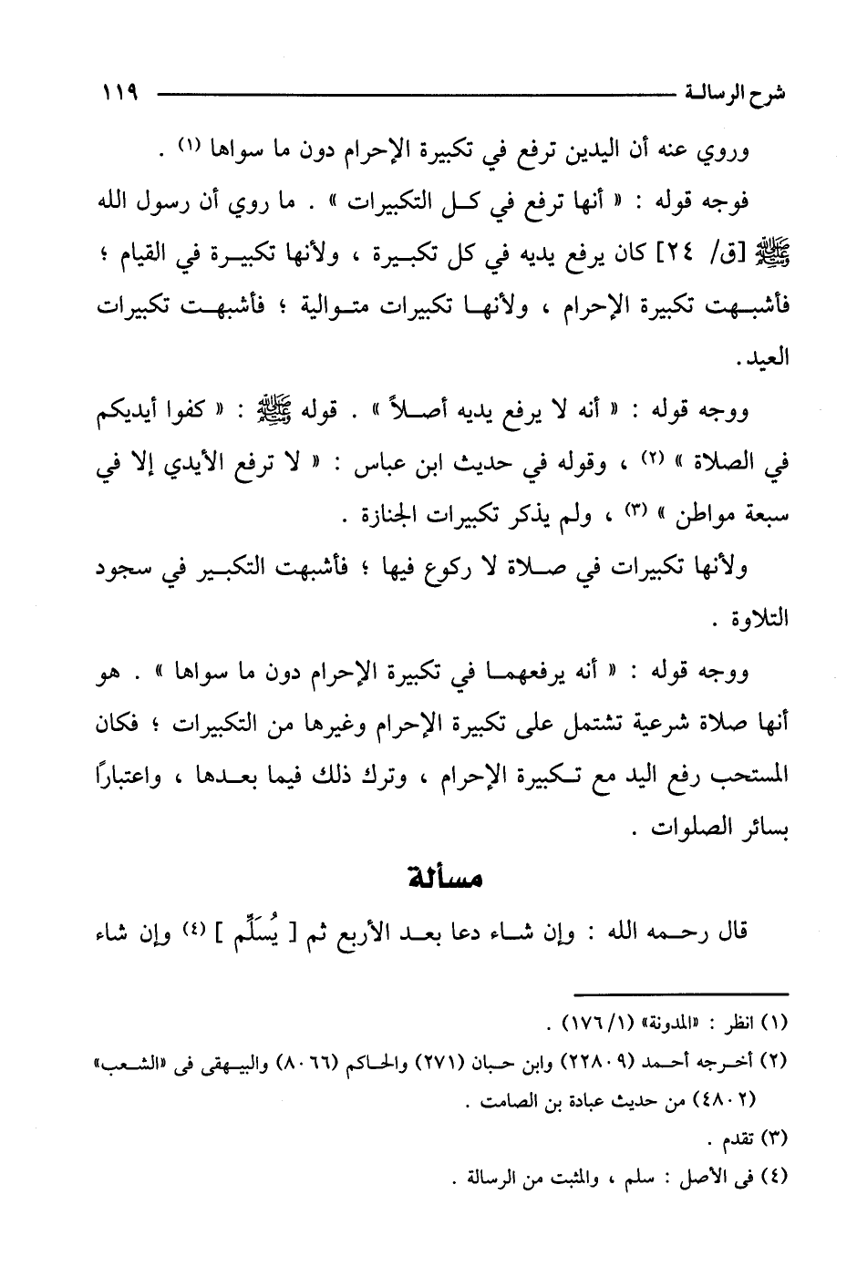 ووجه قوله: "أنه لا يرفع يديه أصلا". قوله صلى الله عليه وسلم: "كفوا أيديكم في الصلاة"، وقوله في حديث ابن عباس: "لا ترفع الأيدي إلا في سبعة مواطن"، ولم يذكر تكبيرات الجنازة.