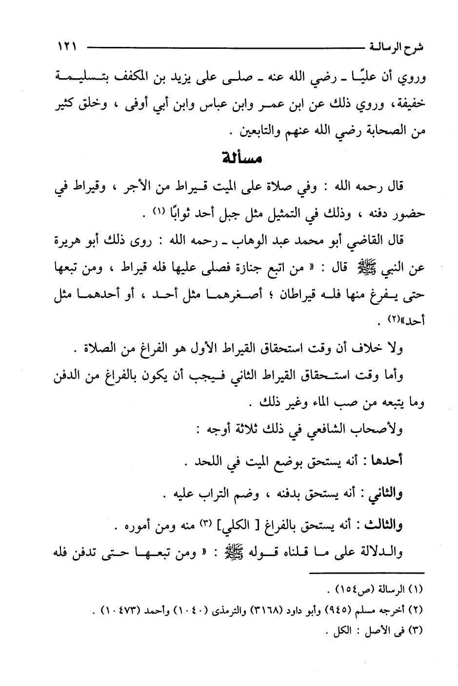 قال القاضي أبو محمد بعد الوهاب- رحمه الله: روى ذلك أبو هريرة عن النبي صلى الله عليه وسلم قال: "من اتبع جنازة فصلى عليها فله قيراط، ومن تبعها حتى يفرغ منها فله قيراطان؛ أصغرهما مثل أحد، أو أحدهما مثل أحد".