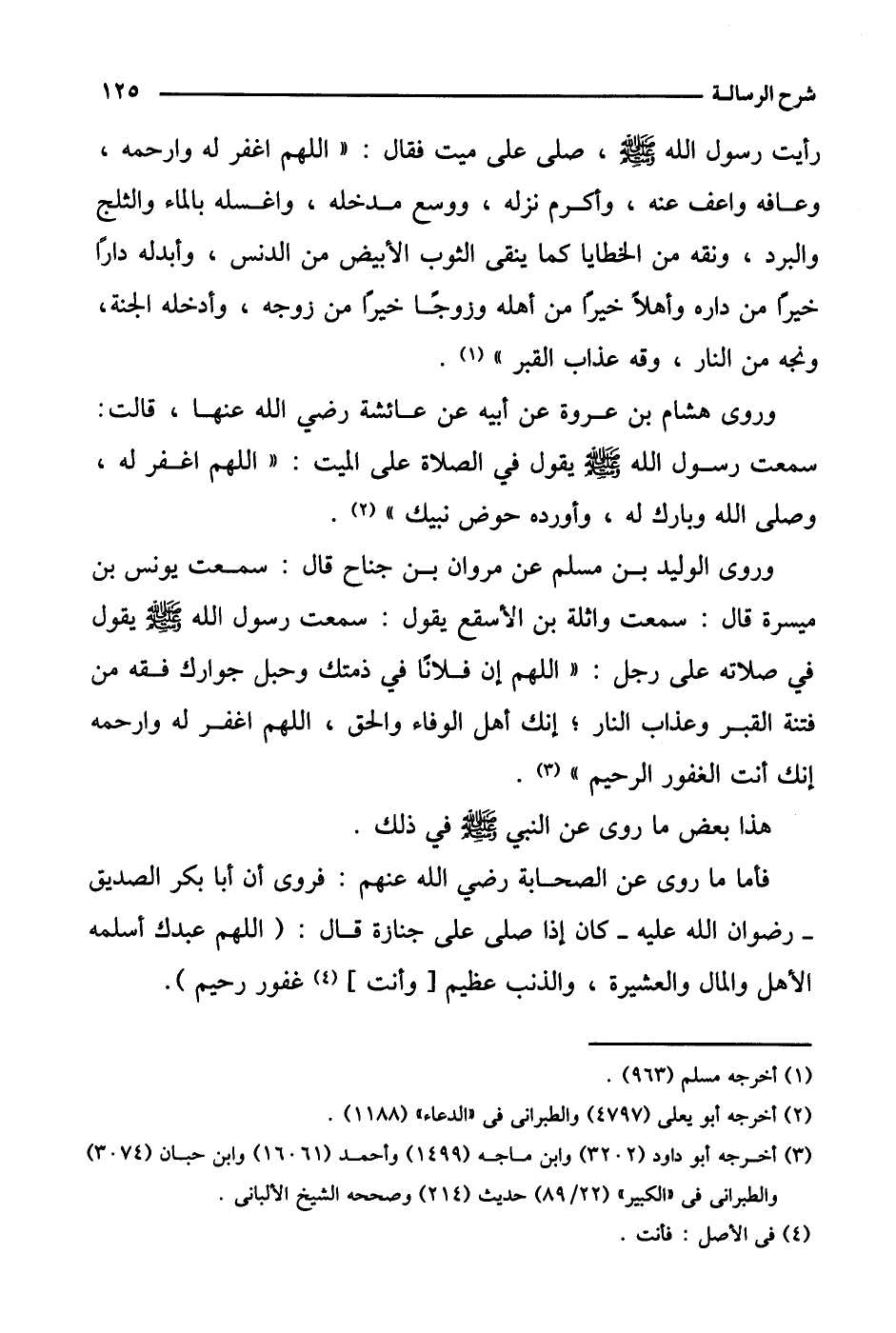 وروى الوليد بن مسلم عن مروان بن جناح قال: سمعت يونس بن مسيرة قال: سمعت واثلة بن الأسقع يقول: سمعت رسول الله صلى الله عليه وسلم يقول في صلاته على رجل: "اللهم إن فلانا في ذمتك وحبل جوارك فقه من فتنة القبر وعذاب النار؛ إنك أهل الوفاء والحق، اللهم اغفر له وارحمه إنك أنت الغفور الرحيم".