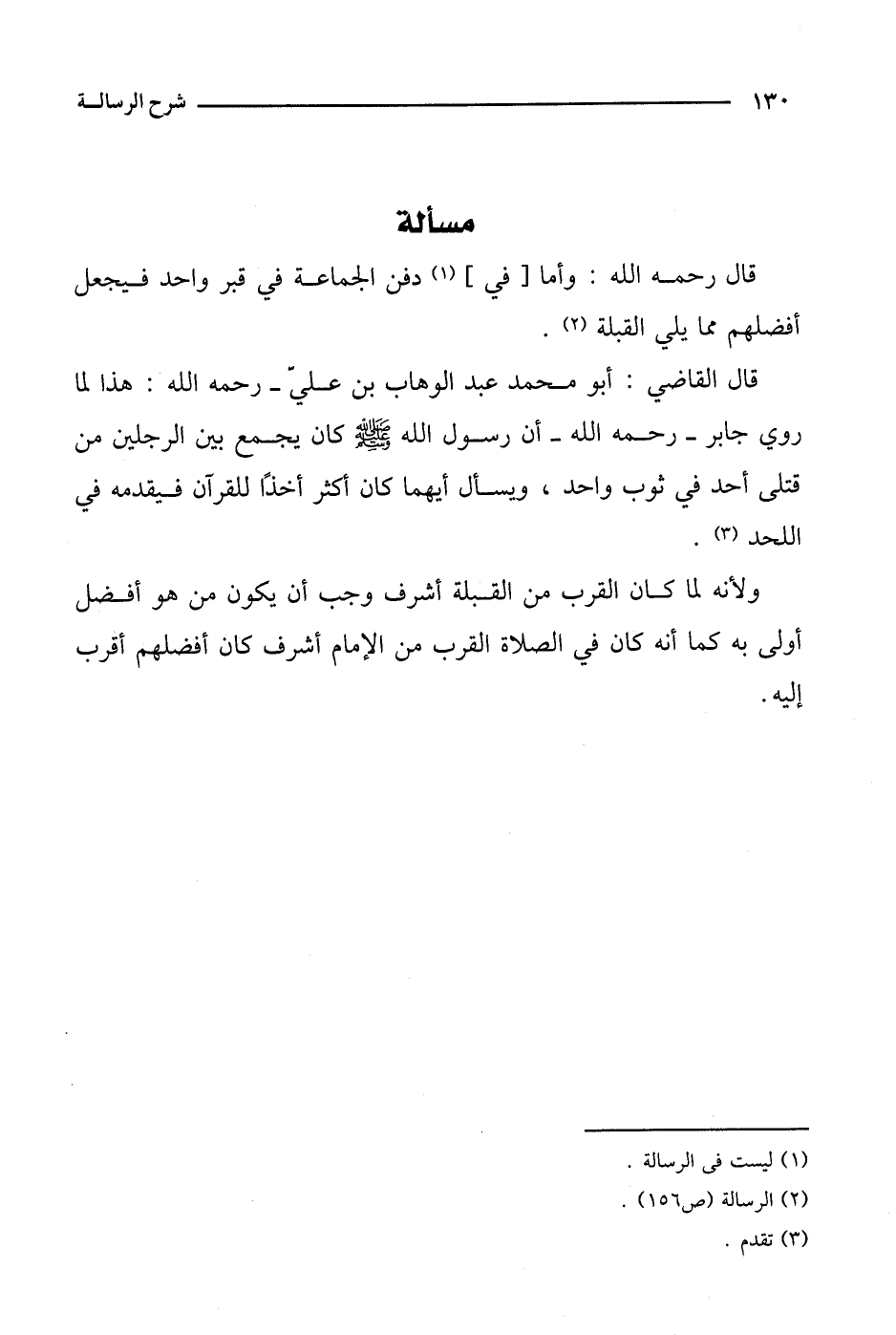 قال القاضي: أبو محمد عبد الوهاب بن علي- رحمه الله: هذا لما روي جابر- رحمه الله- أن رسول الله صلى الله عليه وسلم كان يجمع بين الرجلين من قتلى أحد في ثوب واحد، ويسأل أيهما كان أكثر أخذا للقرآن فيقدمه في اللحد.
