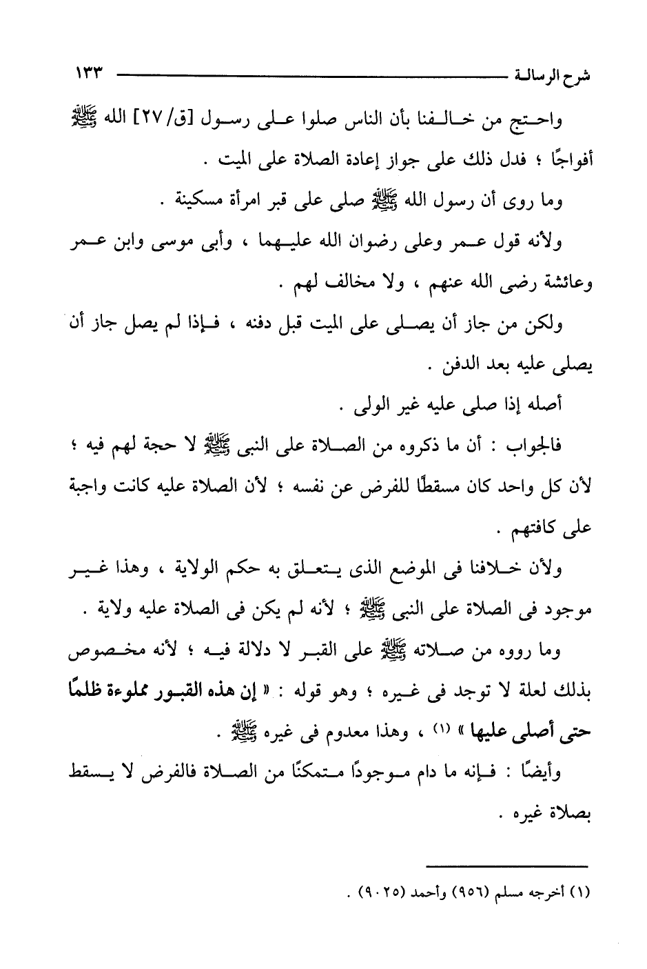 وما رووه من صلاته صلى الله عليه وسلم على القبر لا دلالة فيه؛ لأنه مخصوص بذلك لعلة لا توجد في غيره؛ وهو قوله: "إن هذه القبور مملوءة ظلما حتى أصلي عليها"، وهذا معلوم في غيره صلى الله عليه وسلم.