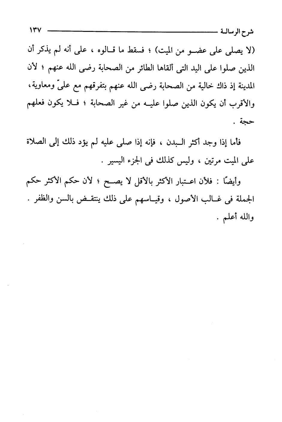 (لا يصلى على عضو من الميت)؛ فسقط ما قالوه، على أنه لم يذكر أن الذين صلوا على اليد التي ألقاها الطائر من الصحابة رضي الله عنهم؛ لأن المدينة إذ ذاك خالية من الصحابة رضي الله عنهم بتفرقهم مع علي ومعاوية، والأقرب أن يكون الذين صلوا عليه من غير الصحابة؛ فلا يكون فعلهم حجة.