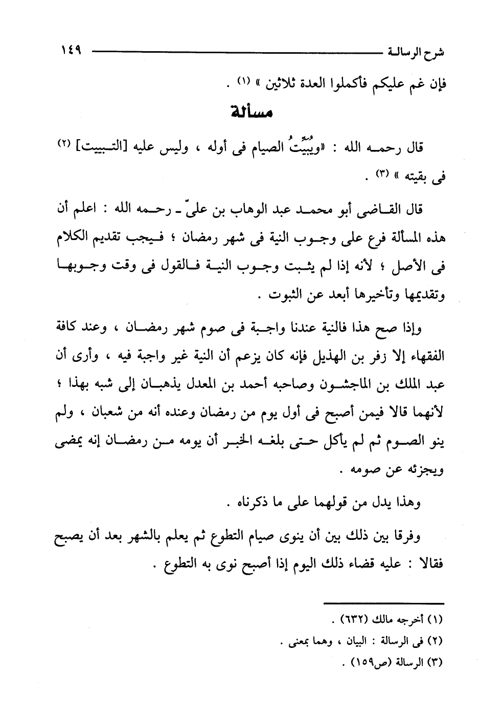 وإذا صح هذا فالنية عندنا واجبة في صوم شهر رمضان، وعند كافة الفقهاء إلا زفر بن الهذيل فإنه كان يزعم أن النية غير واجبة فيه، وأرى أن عبد الملك بن الماجشون وصاحبه أحمد بن المعدل يذهبان إلى شبه بهذا؛ لأنهما قالا فيمن أصبح في أول يوم من رمضان وعنده أنه من شعبان، ولم ينو الصوم ثم لم يأكل حتى بلغه الخبر أن يومه من رمضان إنه يمضي ويجزئه عن صومه.