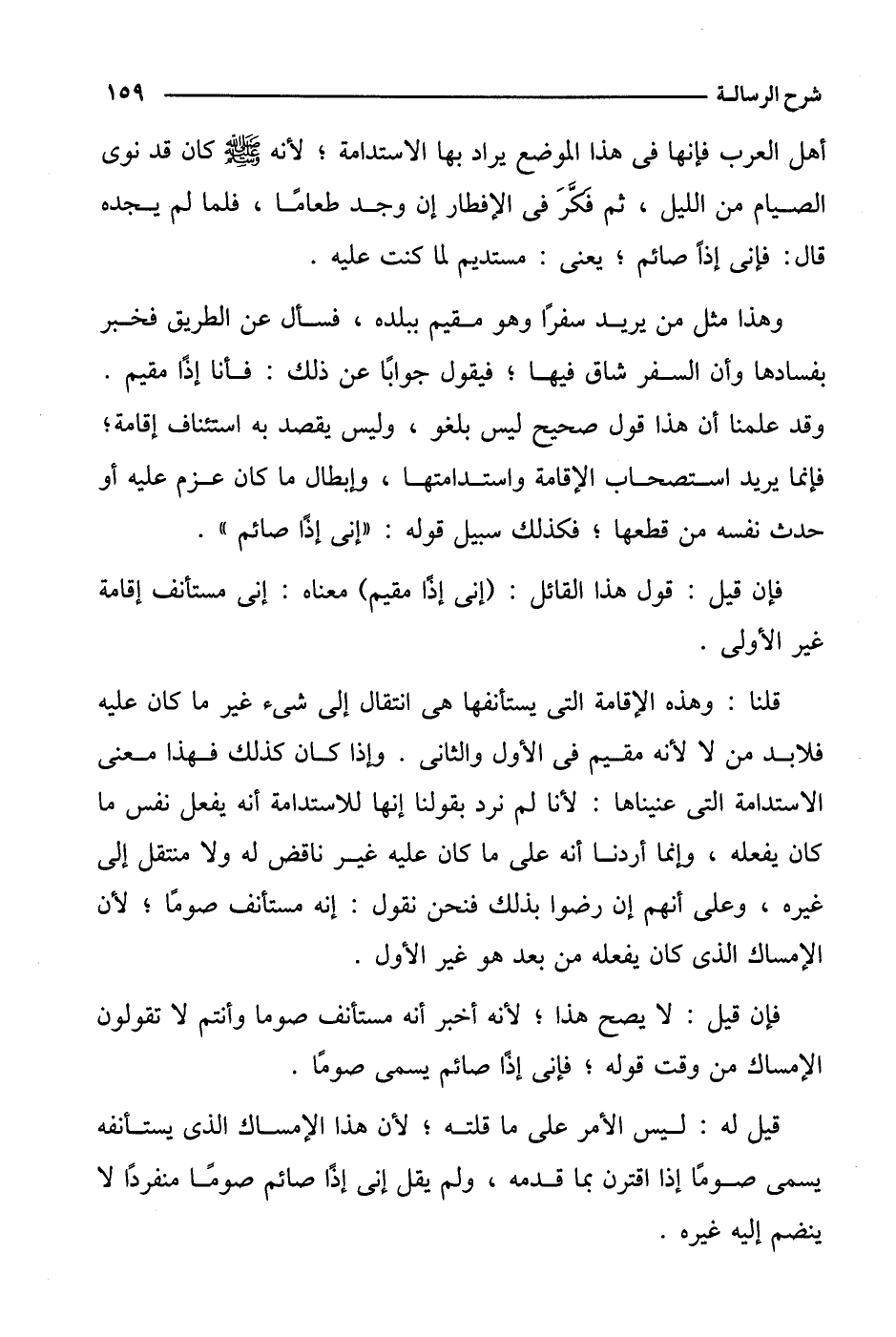 قلنا: وهذه الإقامة التي يستأنفها هي انتقال إلى شيء غير ما كان عليه فلابد من لا لأنه مقيم في الأول والثاني. وإذا كان كذلك فهذا معنى الاستدامة التي عنيناها: لأنا لم نرد بقولنا إنها للاستدامة أنه يفعل نفس ما كان يفعله، وإنما أردنا أنه على ما كان عليه غير ناقض له ولا منتقل إلى غيره، وعلى أنهم إن رضوا بذلك فنحن نقول: إنه مستأنف صوما؛ لأن الإمساك الذي يفعله من بعد هو غير الأول.
