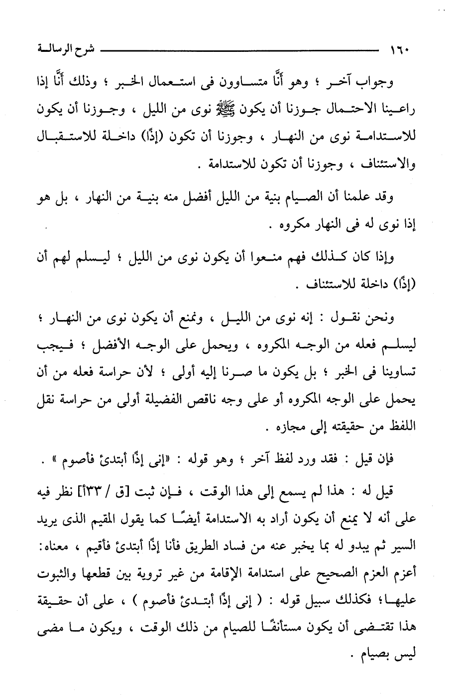 ونحن نقول: إنه نوى من الليل، ونمنع أن يكون نوى من النهار؛ ليسلم فعله من الوجه المكروه، ويحمل على الوجه الأفضل؛ فيجب تساوينا في الخبر؛ بل يكون ما صرنا إليه أولى؛ لأن حراسة فعله من أن يحمل على الوجه المكروه أو على وجه ناقص الفضيلة أولى من حراسة نقل اللفظ من حقيقته إلى مجازه.
