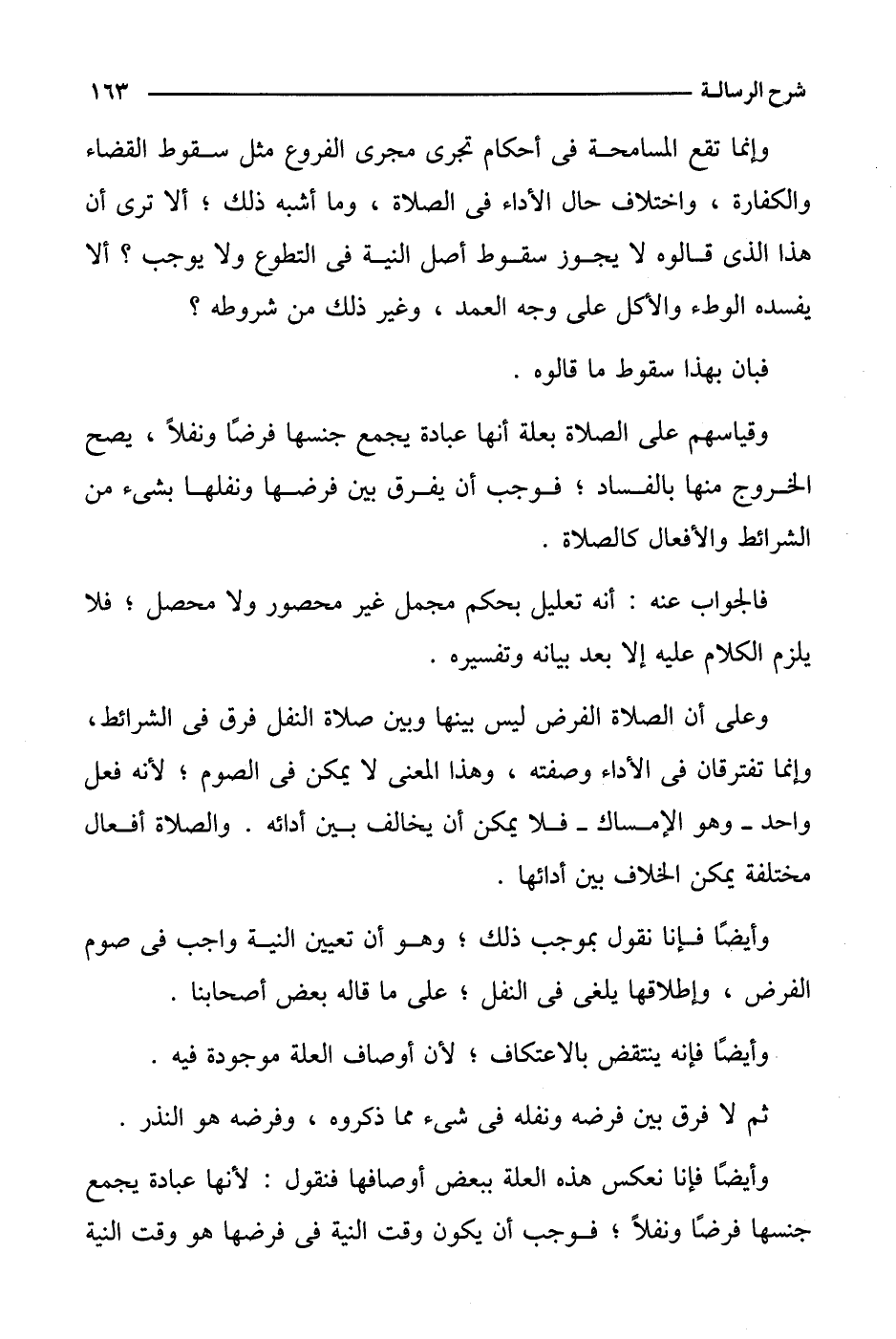 وعلى أن الصلاة الفرض ليس بينها وبين صلاة النفل فرق في الشرائط، وإنما تفترقان في الأداء وصفته، وهذا المعنى لا يمكن في الصوم؛ لأنه فعل واحد- وهو الإمساك- فلا يمكن أن يخالف بين أدائه. والصلاة أفعال مختلفة يمكن الخلاف بين أدائها.