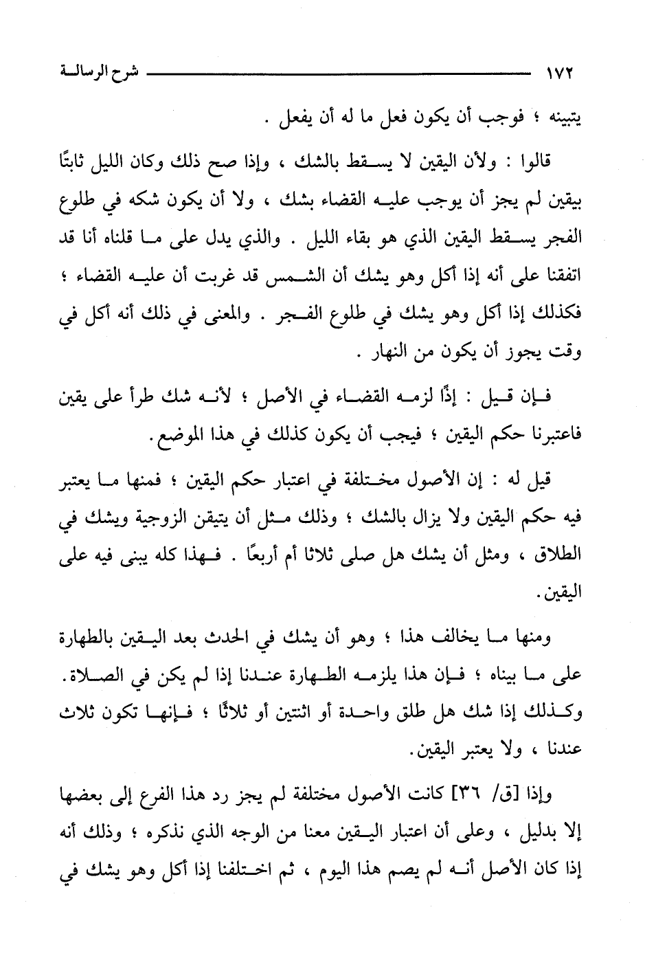 قيل له: إن الأصول مختلفة في اعتبار حكم اليقين؛ فمنها ما يعتبر فيه حكم اليقين ولا يزال بالشك؛ وذلك مثل أن يتيقن الزوجية ويشك في الطلاق، ومثل أن يشك هل صلى ثلاثا أم أربعا. فهذا كله يبنى فيه على اليقين.