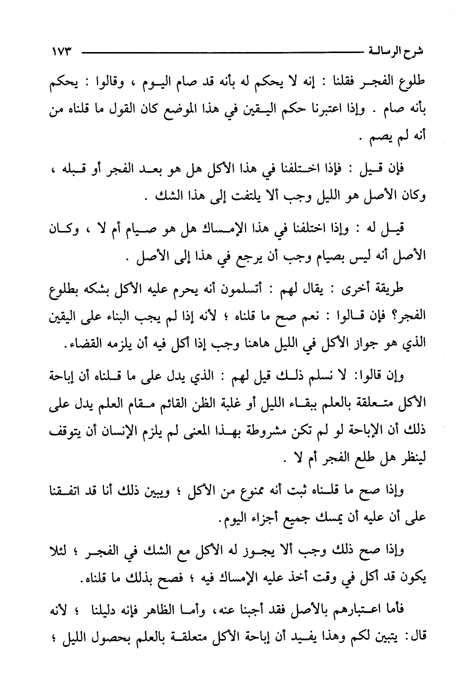 وإذا صح ذلك وجب ألا يجوز له الأكل مع الشك في الفجر؛ لئلا يكون قد أكل في وقت أخذ عليه الإمساك فيه؛ فصح بذلك ما قلناه.