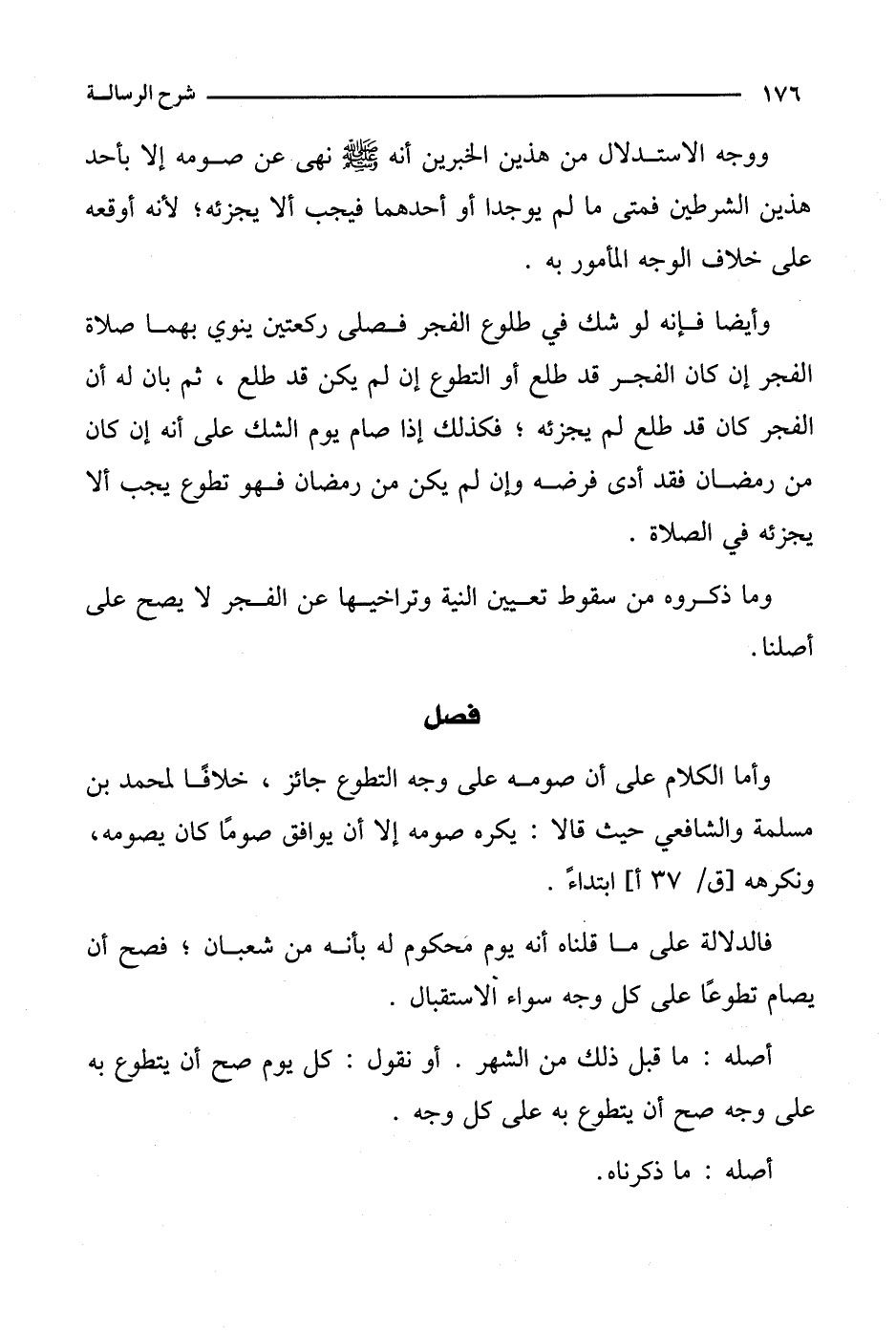 وأيضا فإنه لو شك في طلوع الفجر فصلى ركعتين ينوي بهما صلاة الفجر إن كان الفجر قد طلع أو التطوع إن لم يكن قد طلع، ثم بان له أن الفجر كان قد طلع لم يجزئه؛ فكذلك إذا صام يوم الشك على أنه إن كان من رمضان فقد أدى فرضه وإن لم يكن من رمضان فهو تطوع يجب ألا يجزئه في الصلاة.
