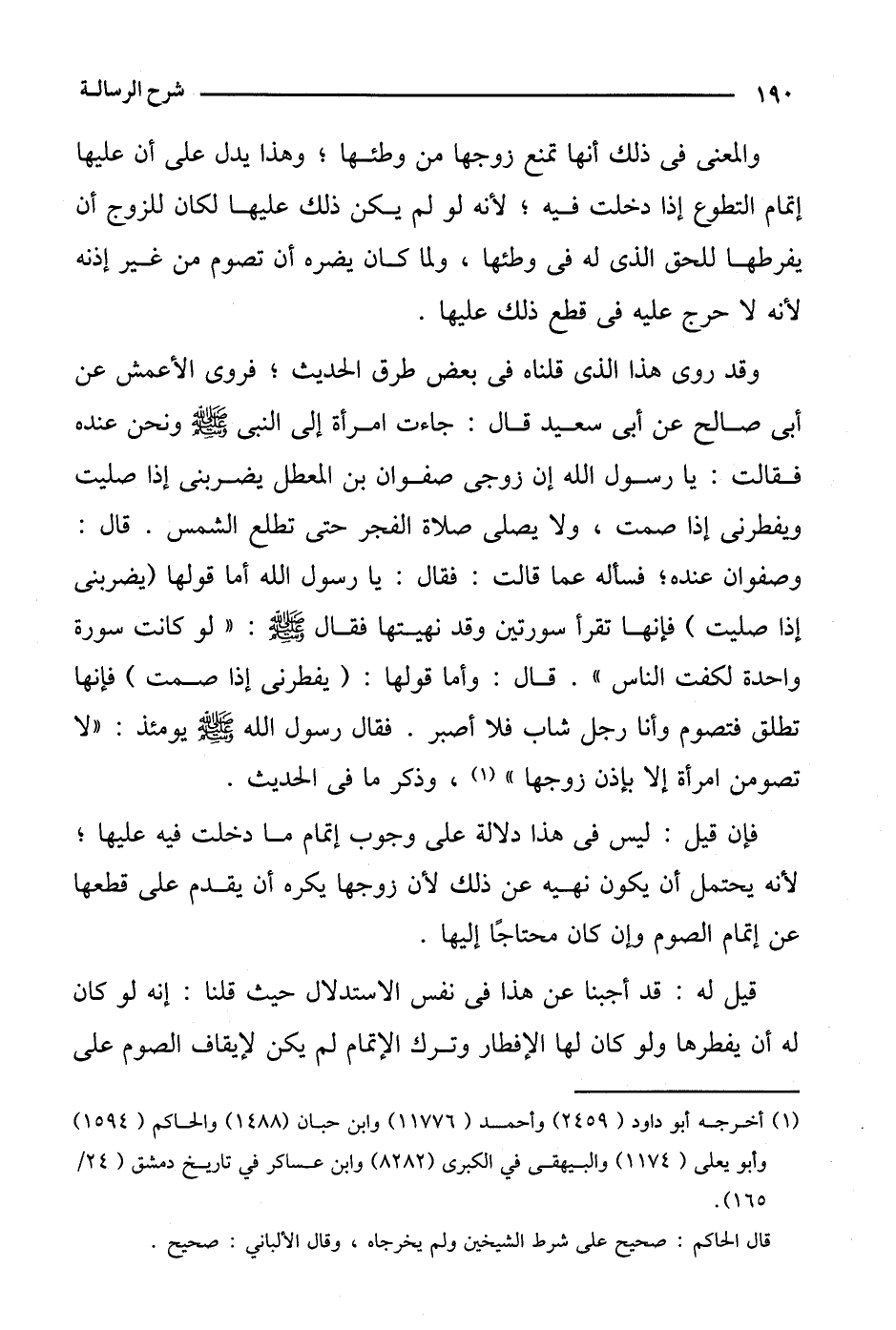 وقد روي هذا الذي قلناه في بعض طرق الحديث؛ فروى الأعمش عن أبي صالح عن أبي سعيد قال: جاءت امرأة إلى النبي صلى الله عليه وسلم ونحن عنده فقالت: يا رسول الله إن زوجي صفوان بن المعطل يضربني إذا صليت ويفطرني إذا صمت، ولا يصلي صلاة الفجر حتى تطلع الشمس. قال: وصفوان عنده؛ فسأله عما قالت: فقال: يا رسول الله أما قولها (يضربني إذا صليت) فإنها تقرأ سورتين وقد نهيتها فقال صلى الله عليه وسلم: "لو كانت سورة واحدة لكفت الناس". قال: وأما قولها: (يفطرني إذا صمت) فإنها تطلق فتصوم وأنا رجل شاب فلا أصبر. فقال رسول الله صلى الله عليه وسلم يومئذ: "لا تصومن امرأة إلا بإذن زوجها"، وذكر ما في الحديث.