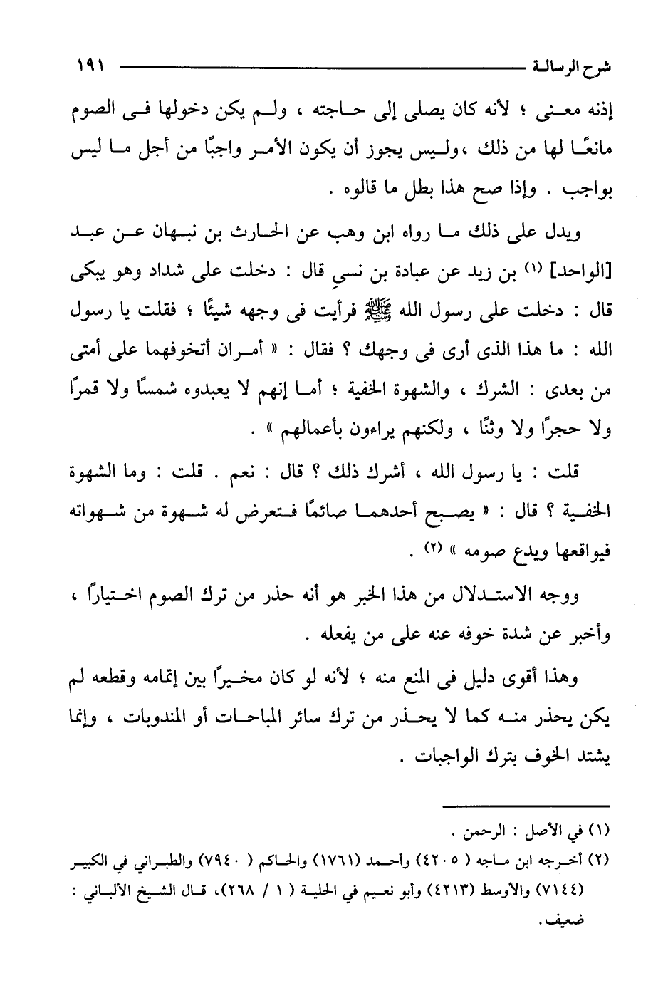 ويدل على ذلك ما رواه ابن وهب عن الحارث بن نبهان عن عبد [الواحد] بن زيد عن عبادة بن نسي قال: دخلت على شداد وهو يبكي قال: دخلت على رسول الله صلى الله عليه وسلم فرأيت في وجهه شيئا؛ فقلت يا رسول الله: ما هذا الذي أرى في وجهك؟ فقال: "أمران أتخوفهما على أمتي من بعدي: الشرك، والشهوة الخفية؛ أما إنهم لا يعبدوه شمسا ولا قمرا ولا حجرا ولا وثنا، ولكنهم يراءون بأعمالهم".
