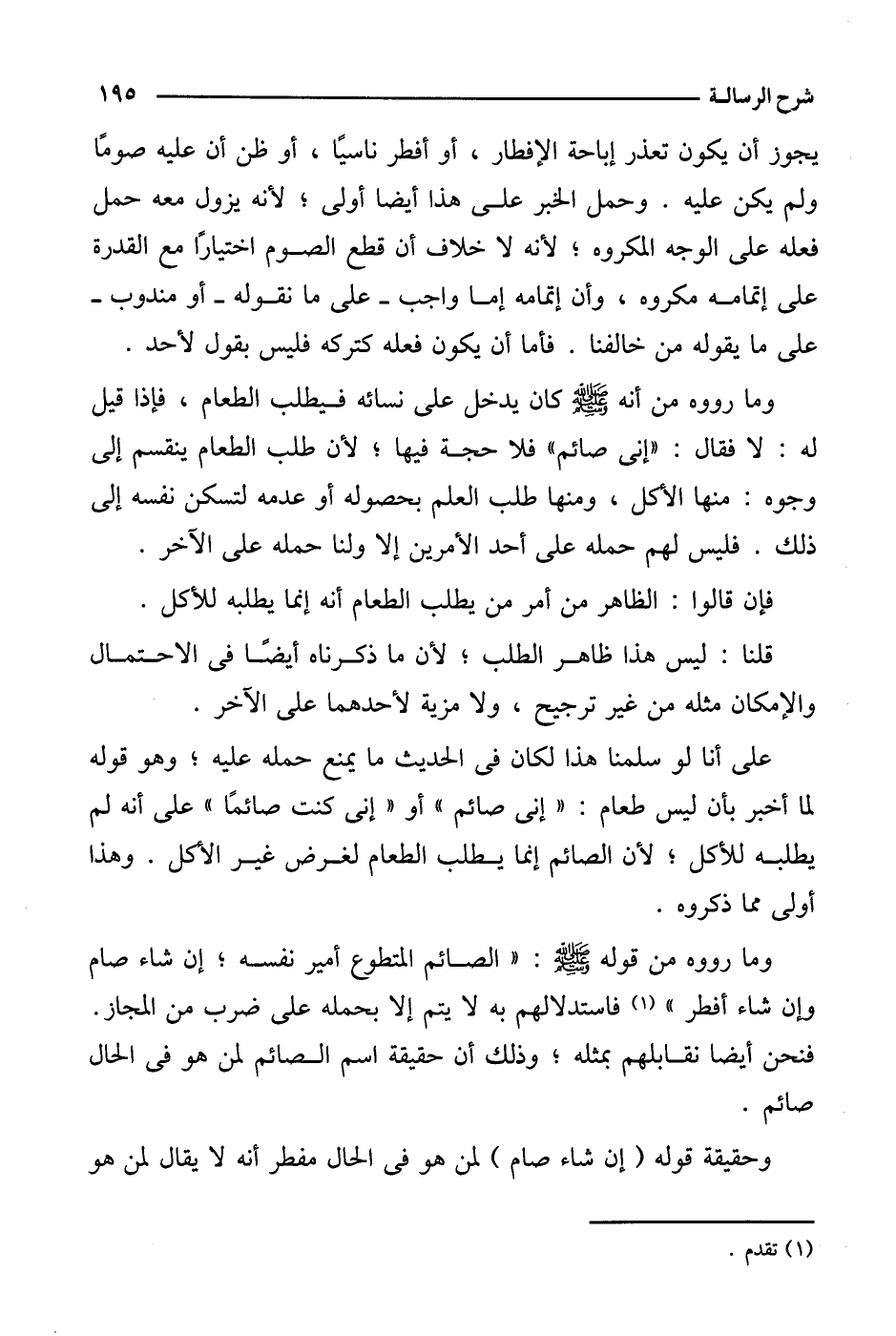 وما رووه من أنه صلى الله عليه وسلم كان يدخل على نسائه فيطلب الطعام، فإذا قيل له: لا فقال: "إني صائم" فلا حجة فيها؛ لأن طلب الطعام ينقسم إلى وجوه: منها الأكل، ومنها طلب العلم بحصوله أو عدمه لتسكن نفسه إلى ذلك. فليس لهم حمله على أحد الأمرين إلا ولنا حمله على الآخر.