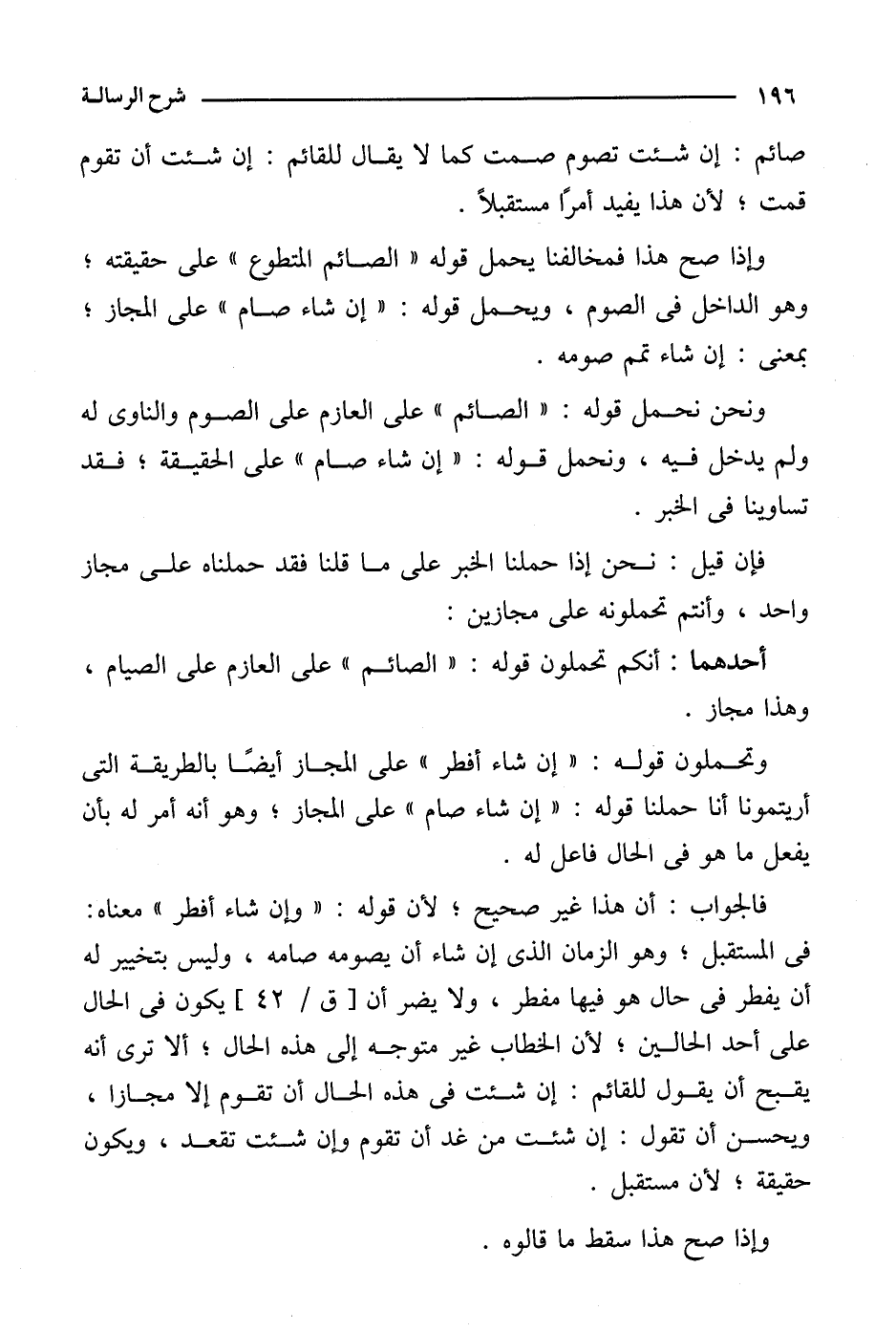 وتحملون قوله: "إن شاء أفطر" على المجاز أيضا بالطريقة التي أريتمونا أنا حملنا قوله: "إن شاء صام" على المجاز؛ وهو أنه أمر له بأن يفعل ما هو في الحال فاعل له.