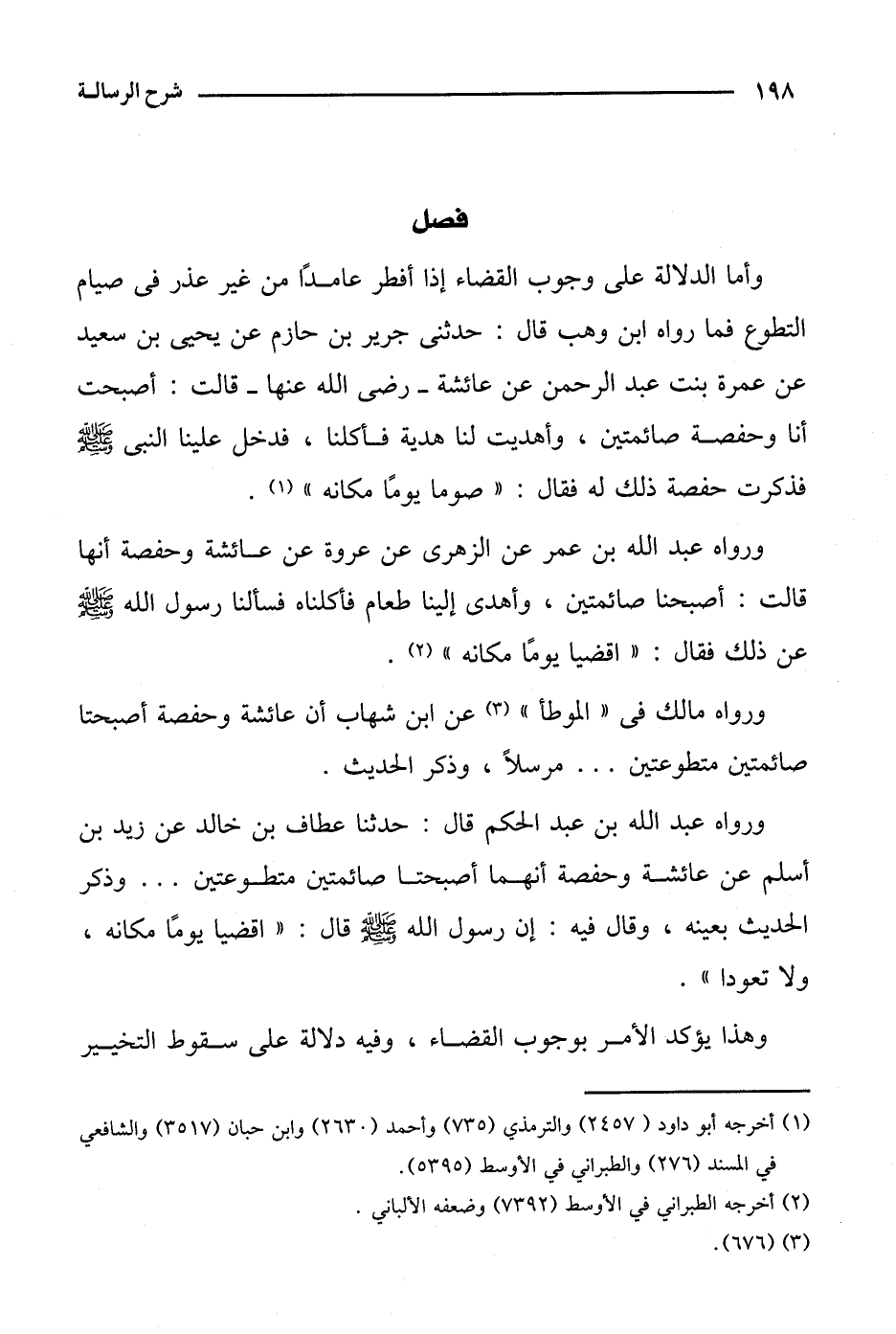وأما الدلالة على وجوب القضاء إذا أفطر عامدا من غير عذر في صيام التطوع فما رواه ابن وهب قال: حدثني جرير بن حازم عن يحيى بن سعيد عن عمرة بني عبد الرحمن عن عائشة- رضي الله عنها- قالت: أصبحت أنا وحفصة صائمتين، وأهديت لنا هدية فأكلنا، فدخل علينا النبي صلى الله عليه وسلم فذكرت حفصة ذلك له فقال: "صوموا يوما مكانه".