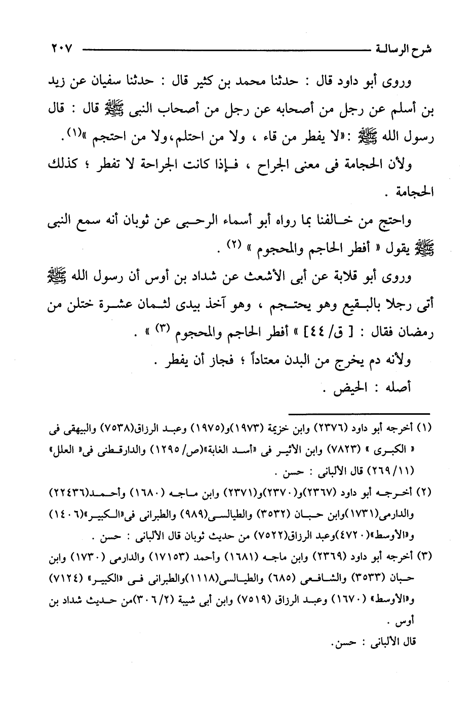 وروى أبو داود قال: حدثنا محمد بن كثير قال: حدثنا سفيان عن زيد بن أسلم عن رجل من أصحابه عن رجل من أصحاب النبي صلى الله عليه وسلم قال: قال رسول الله صلى الله عليه وسلم: "لا يفطر من قاء، ولا من احتلم، ولا من احتجم".