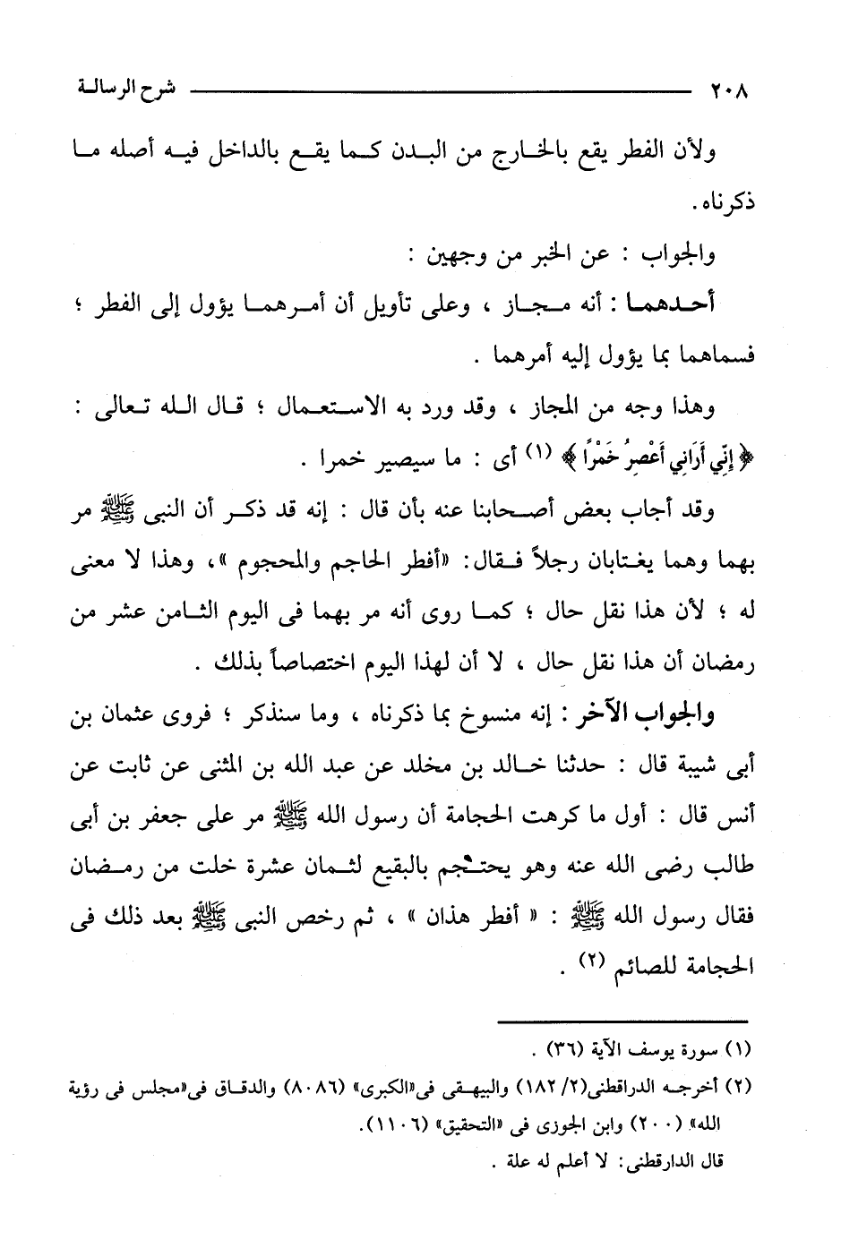 وقد أجاب بعض أصحابنا عنه بأن قال: إنه قد ذكر أن النبي صلى الله عليه وسلم مر بهما وهما يغتابان رجلا فقال: "أفطر الحاجم والمحجوم"، وهذا لا معنى له؛ لأن هذا نقل حال،؛ كما روي أنه مر بهما في اليوم الثامن عشر من رمضان أن هذا نقل حال، لا أن لهذا اليوم اختصاصا بذلك.