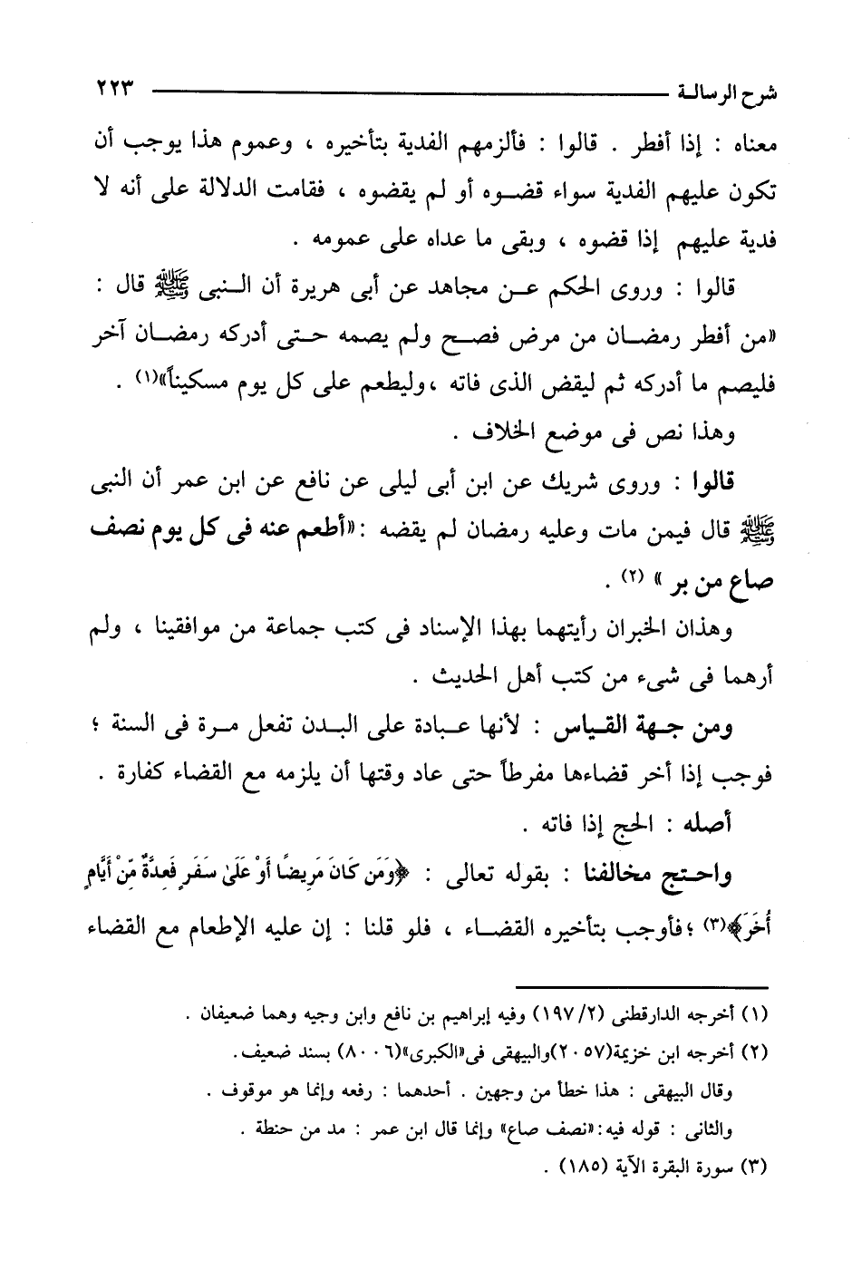 قالوا: وروى شريك عن ابن أبي ليلى عن نافع عن ابن عمر أن النبي صلى الله عليه وسلم قال فيمن مات وعليه رمضان لم يقضه: "أطعم عنه في كل يوم نصف صاع من بر".