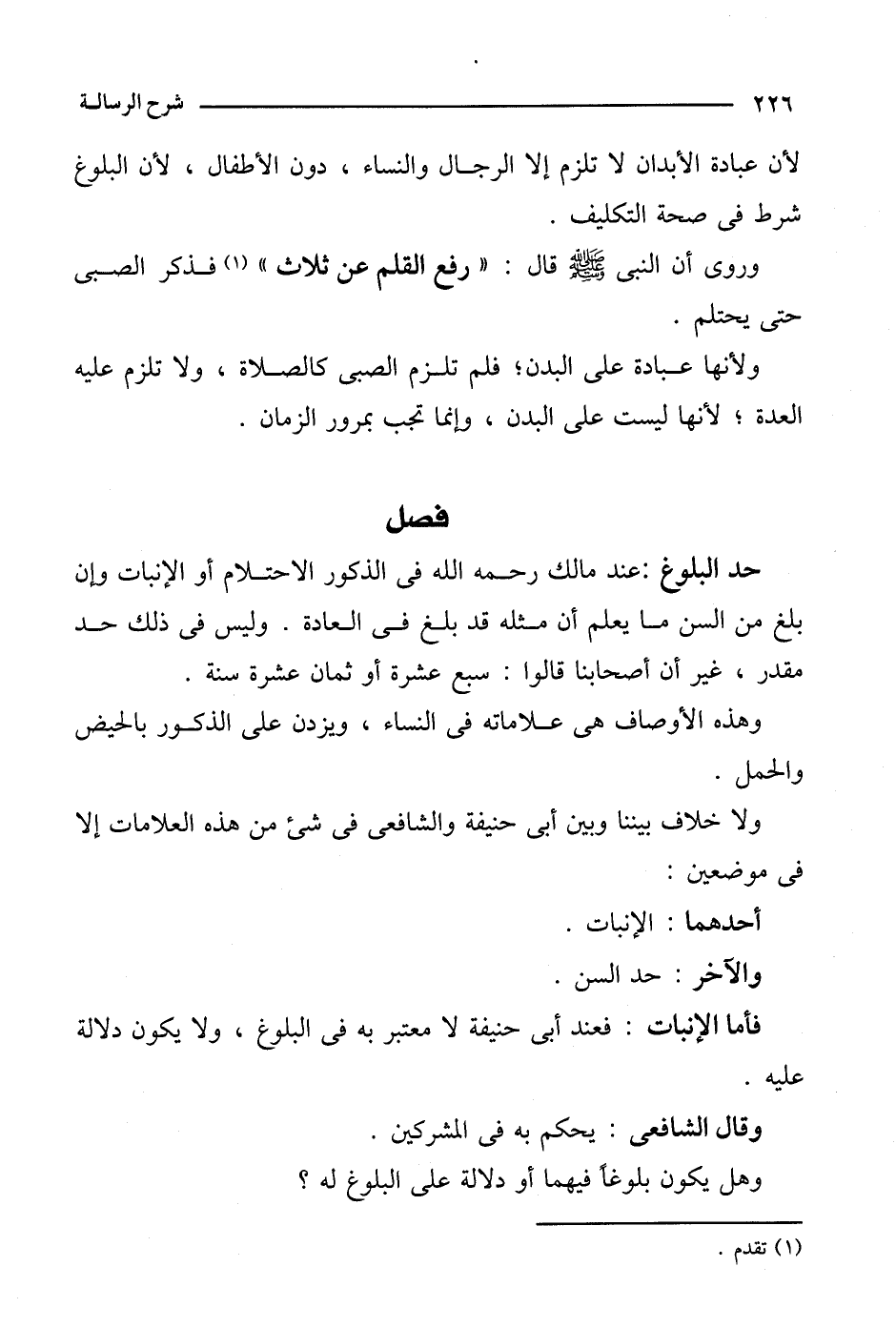 حد البلوغ: عند مالك رحمه الله في الذكور الاحتلام أو الإنبات وإن بلغ من السن ما يعلم أن مثله قد بلغ في العادة. وليس في ذلك حد مقدر، غير أن أصحابنا قالوا: سبع عشرة أو ثمان عشرة سنة.