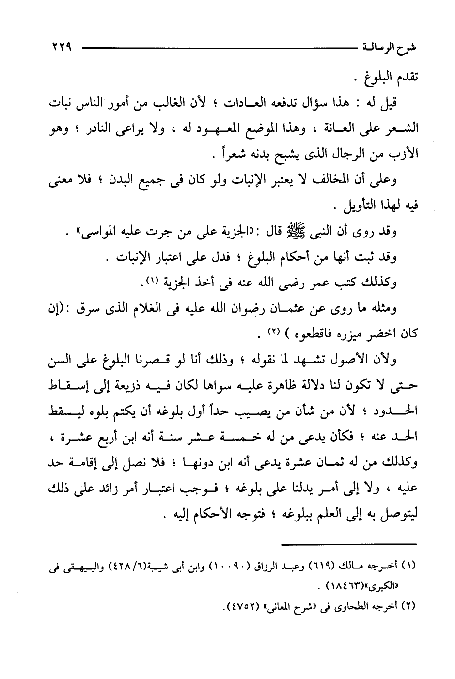 ولأن الأصول تشهد لما نقوله؛ وذلك أنا لو قصرنا البلوغ على السن حتى لا تكون لنا دلالة ظاهرة عليه سواها لكان فيه ذريعة إلى إسقاط الحدود؛ لأن من شأن من يصيب حدا أول بلوغه أن يكتم بلوه ليسقط الحد عنه؛ فكأن يدعى من له خمسة عشر سنة أنه ابن أربع عشرة، وكذلك من له ثمان عشرة يدعى أنه ابن دونها؛ فلا نصل إلى إقامة حد عليه، ولا إلى أمر يدلنا على بلوغه؛ فوجب اعتبار أمر زائد على ذلك ليتوصل به إلى العلم ببلوغه؛ فتوجه الأحكام إليه.