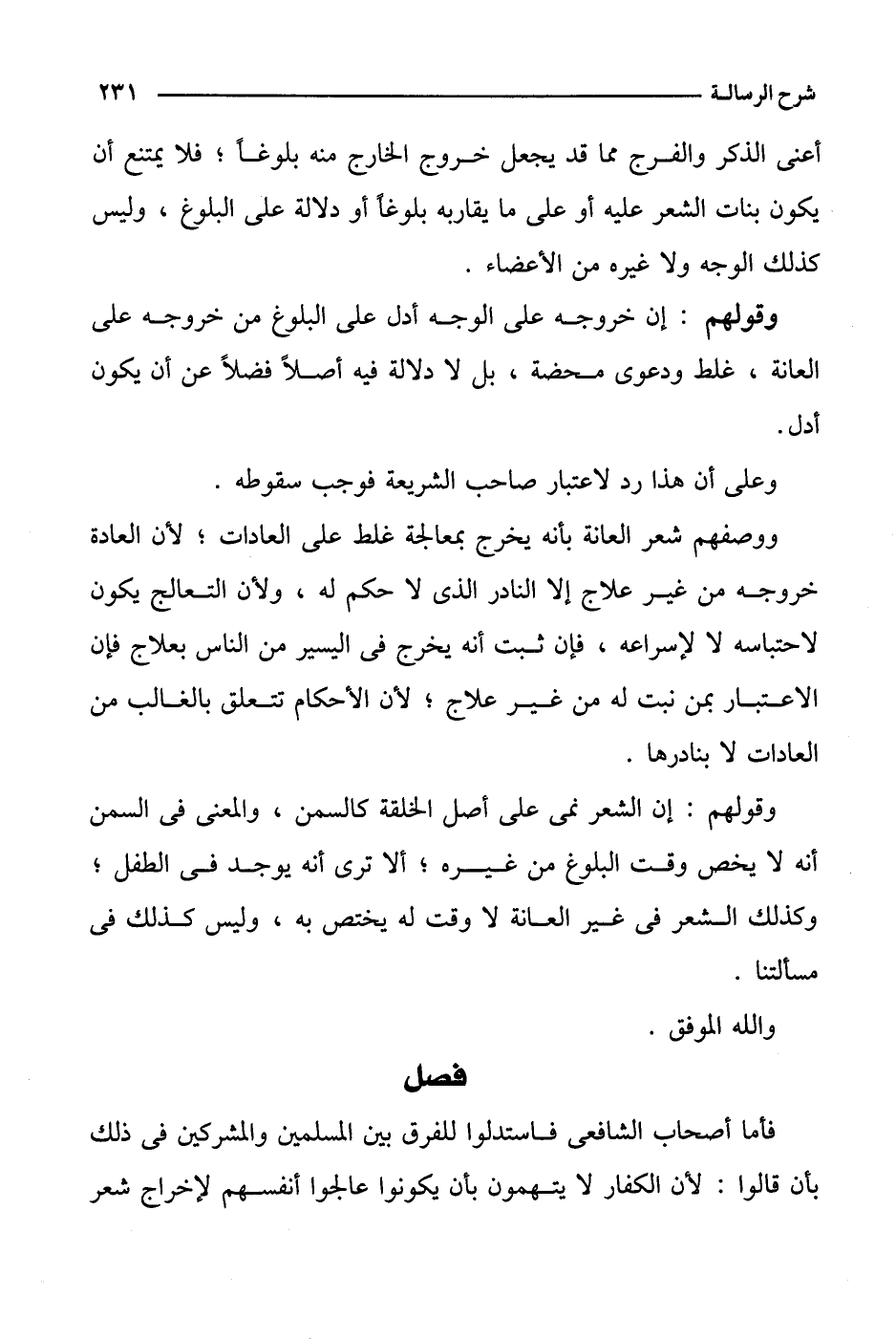 أعني الذكر والفرج مما قد يجعل خروج الخارج منه بلوغا؛ فلا يمتنع أن يكون بنات الشعر عليه أو على ما يقاربه بلوغا أو دلالة على البلوغ، وليس كذلك الوجه ولا غيره من الأعضاء.