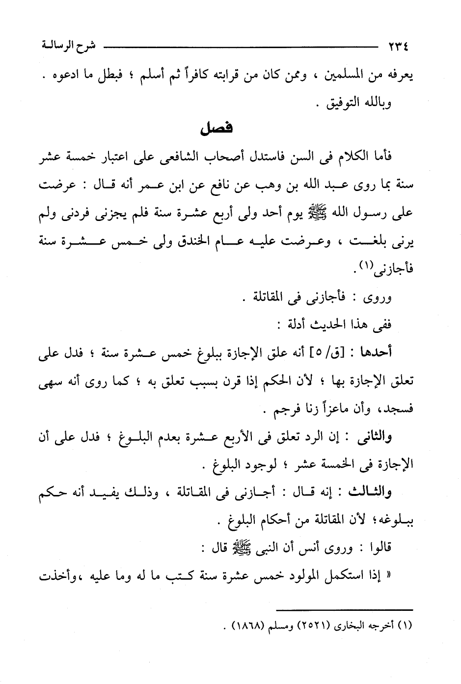 فإما الكلام في السن فاستدل أصحاب الشافعي على اعتبار خمسة عشر سنة بما روى عبد الله بن وهب عن نافع عن ابن عمر أنه قال: عرضت على رسول الله صلى الله عليه وسلم يوم أحد ولى أربع عشرة سنة فلم يجزني فردني ولم يرني بلغت، وعرضت عليه عام الخندق ولى خمسة عشرة سنة فأجازني.