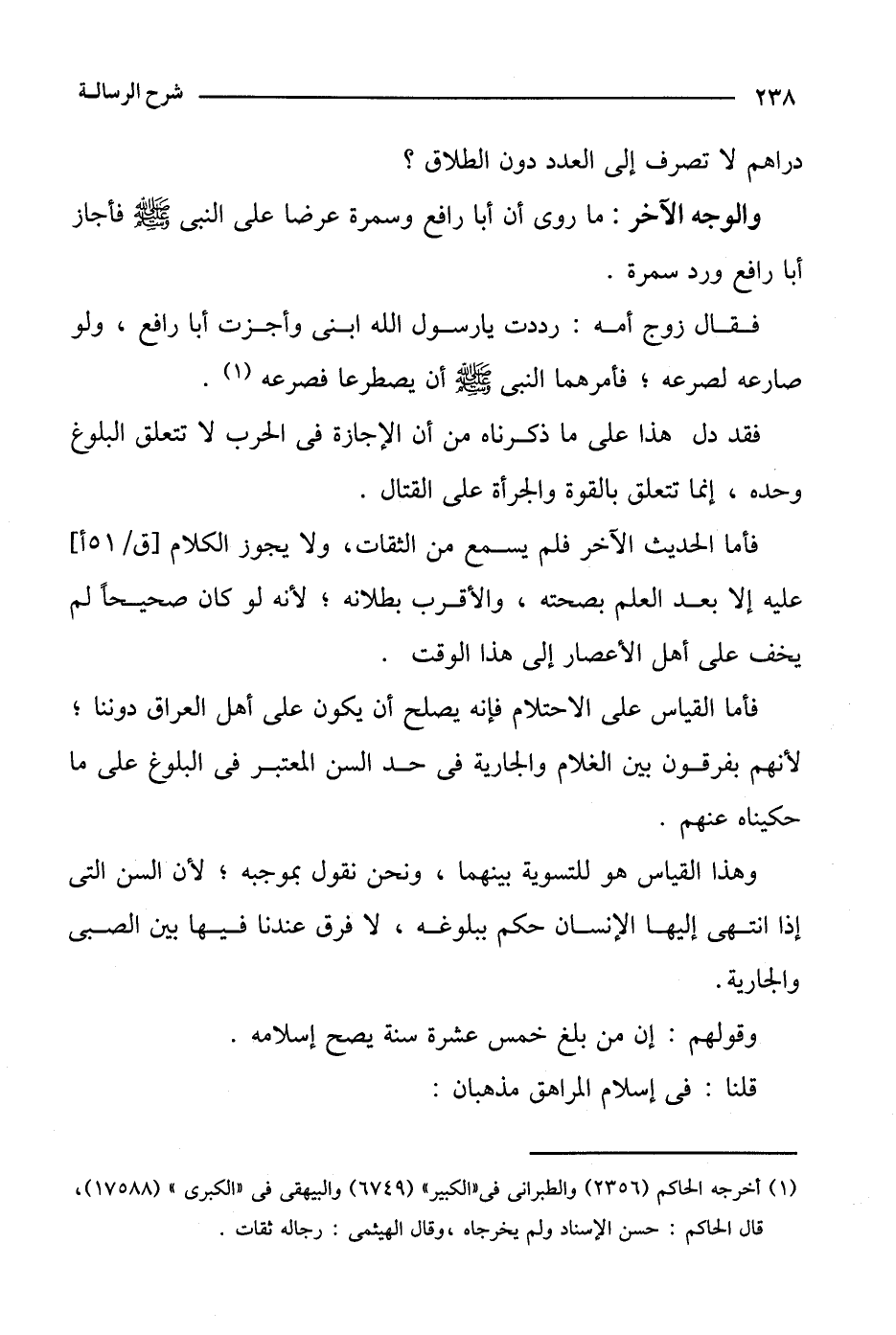 فأما القياس على الاحتلام فإنه يصلح أن يكون على أهل العراق دوننا؛ لأنهم يفرقون بين الغلام والجارية في حد السن المعتبر في البلوغ على ما حكيناه عنهم.
