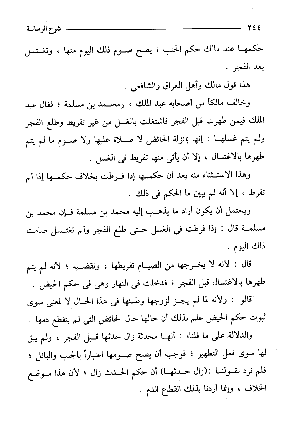 وخالف مالكا من أصحابه عبد الملك، ومحمد بن مسلمة؛ فقال عبد الملك فيمن طهرت قبل الفجر فاشتغلت بالغسل من غير تفريط وطلع الفجر ولم يتم غسلها: إنها بمنزلة الحائض لا صلاة عليها ولا صوم ما لم يتم طهرها بالاغتسال، إلا أن يأتي منها تفريط في الغسل.
