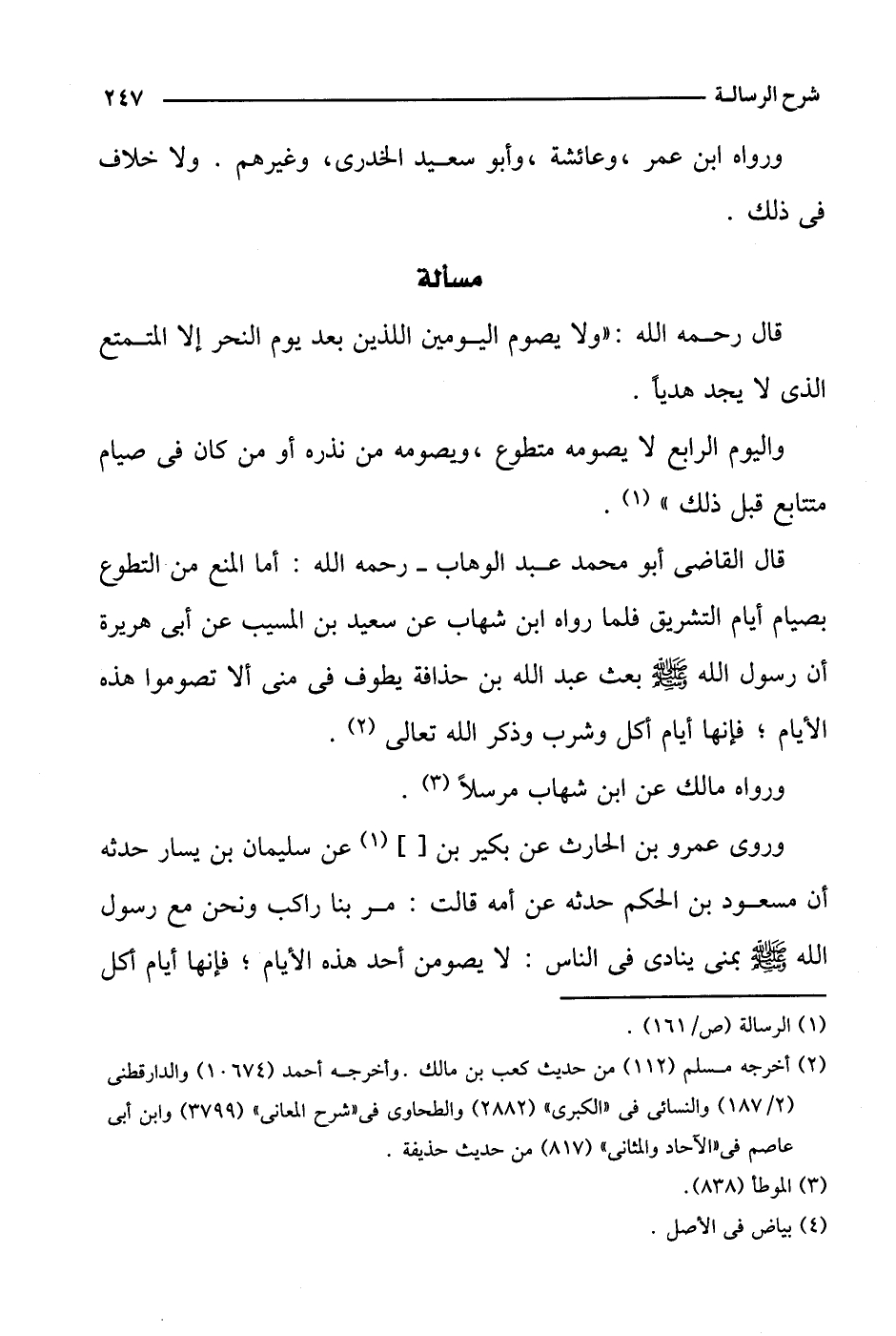 قال القاضي أبو محمد عبد الوهاب- رحمه الله: أما المنع من التطوع بصيام أيام التشريق فلما رواه ابن شهاب عن سعيد بن المسيب عن أبي هريرة أن رسول الله صلى الله عليه وسلم بعث عبد الله بن حذافة يطوف في منى ألا تصوموا هذه الأيام؛ فإنها أيام أكل وشرب وذكر الله تعالى.
