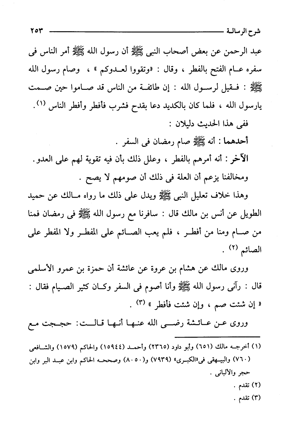 وروى مالك عن هشام بن عروة عن عائشة أن حمزة بن عمرة الأسلمي قال: رآني رسول الله صلى الله عليه وسلم وأنا أصوم في السفر وكان كثير الصيام فقال: "إن شئت صم، وإن شئت فأفطر".