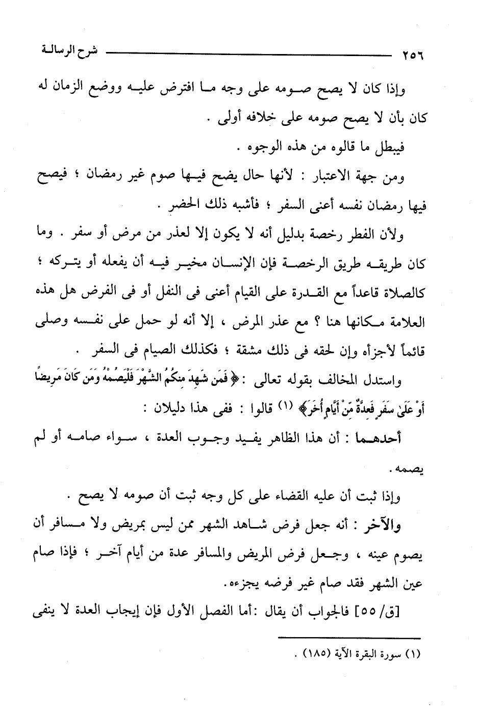 واستدل المخالف بقوله تعالى: {فمن شهد منكم الشهر فليصمه ومن كان مريضا أو على سفر فعدة من أيام أخر} قالوا: ففي هذا دليلان: