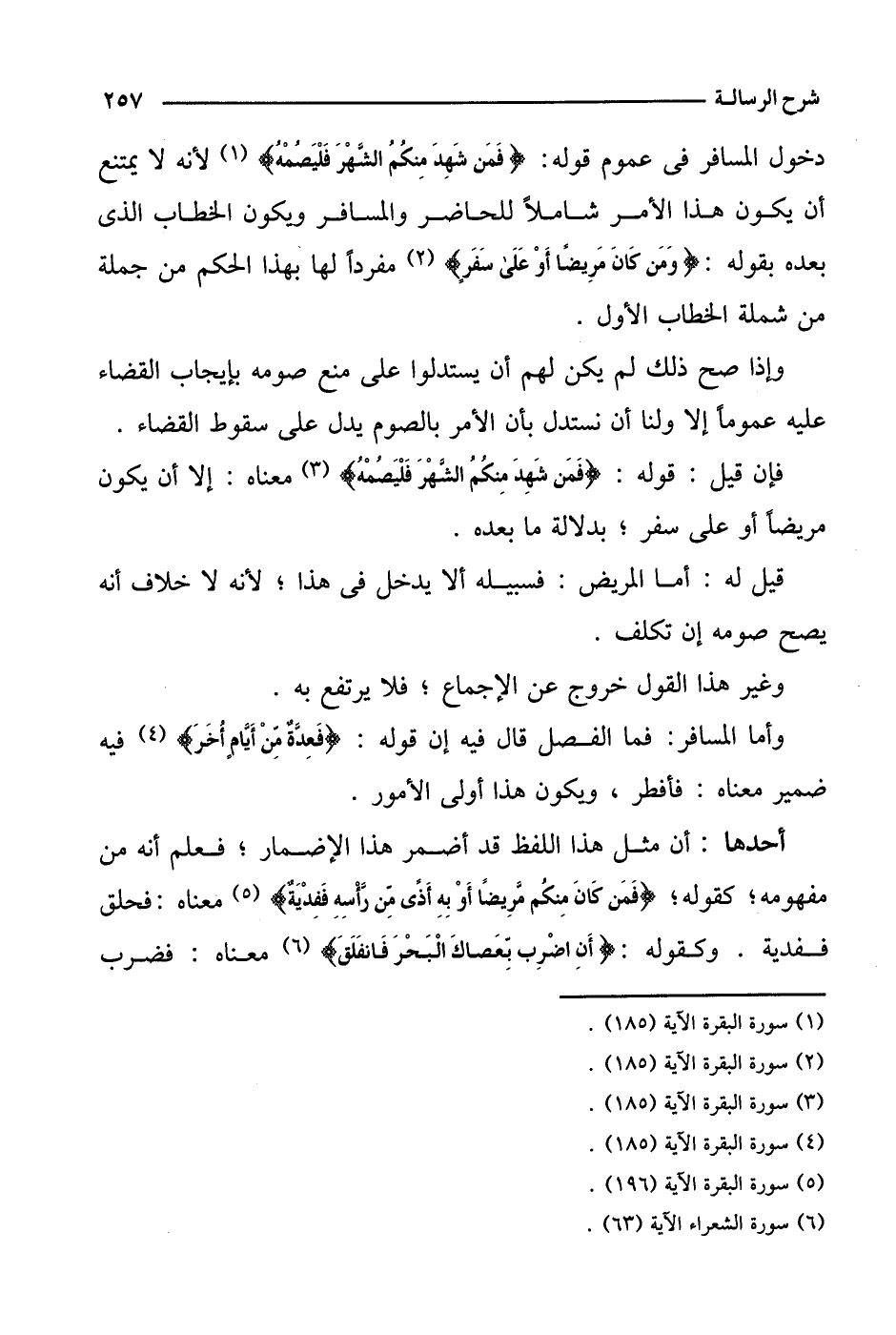 دخول المسافر في عموم قوله: {فمن شهد منكم الشهر فليصمه} لأنه لا يمتنع أن يكون هذا الأمر شاملا للحاضر والمسافر ويكون الخطاب الذي بعده بقوله: {ومن كان مريضا أو على سفر} مفردا لها بهذا الحكم من جملة من شملة الخطاب الأول.