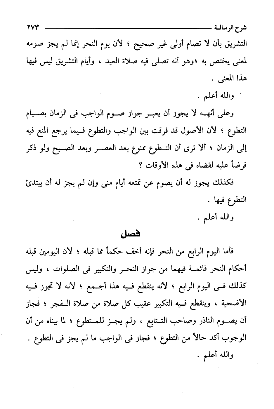 فأما اليوم الرابع من النحر فإنه أخف حكما مما قبله؛ لأن اليومين قبله أحكام النحر قائمة فيهما من جواز النحر والتكبير في الصلوات، وليس كذلك في اليوم الرابع؛ لأنه ينقطع فيه هذا أجمع؛ لأنه لا تجوز فيه الأضحية، وينقطع فيه التكبير عقيب كل صلاة من صلاة الفجر؛ فجاز أن يصوم الناذر وصاحب التتابع، ولم يجز للمتطوع؛ لما بيناه من أن الوجوب أكد حالا من التطوع؛ فجاز في الواجب ما لم يجز في التطوع.