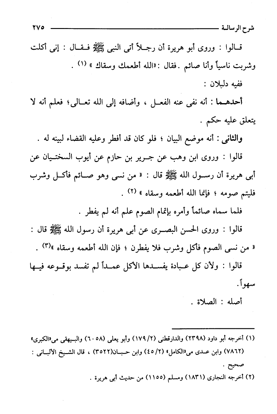 قالوا: وروى ابن وهب عن جرير بن حازم عن أيوب السختيان عن أبي هريرة أن رسول الله صلى الله عليه وسلم قال: "من نسى وهو صائم فأكل وشرب فليتم صومه؛ فإنما الله أطعمه وسقاه".