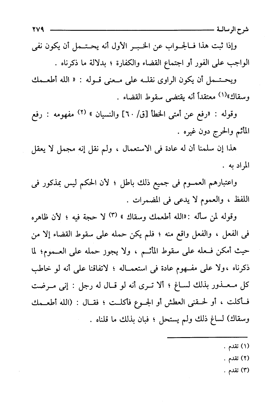 وقوله لمن سأله: "الله أطعمك وسقاك" لا حجة فيه؛ لأن ظاهره في الفعل، والفعل واقع منه؛ فلم يكن حمله على سقوط القضاء إلا من حيث أمكن فعله على سقوط المأثم، ولا يجوز حمله على العموم؛ لما ذكرناه، ولا على مفهوم عادة في استعماله، لاتفاقنا على أنه لو خاطب كل معذور بذلك لساغ؛ ألا ترى أنه لو قال له رجل: إني مرضت فأكلت، أو لحقني العطش أو الجوع فأكلت؛ فقال: (الله أطعمك وسقاك) لساع ذلك ولم يستحل؛ فبان بذلك ما قلناه.