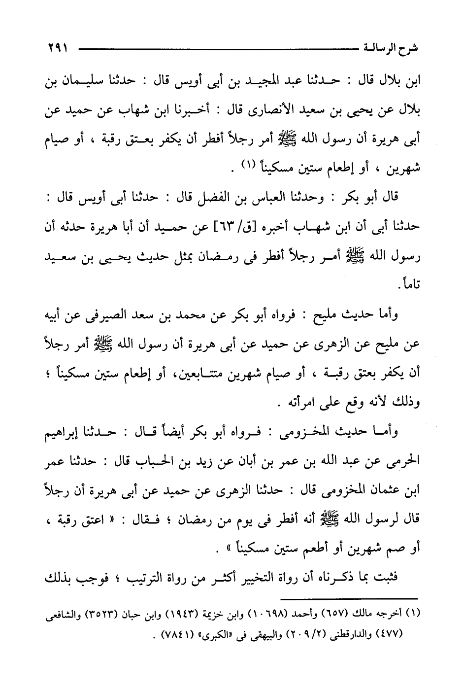 ابن بلال قال: حدثنا عبد المجيد بن أبي أويس قال: حدثنا سليمان بن بلال عن يحيى بن سعيد الأنصاري قال: أخبرنا ابن شهاب عن حميد عن أبي هريرة أن رسول الله صلى الله عليه وسلم أمر رجلا أفطر أن يكفر بعتق رقبة، أو صيام شهرين، أو إطعام ستين مسكينا.