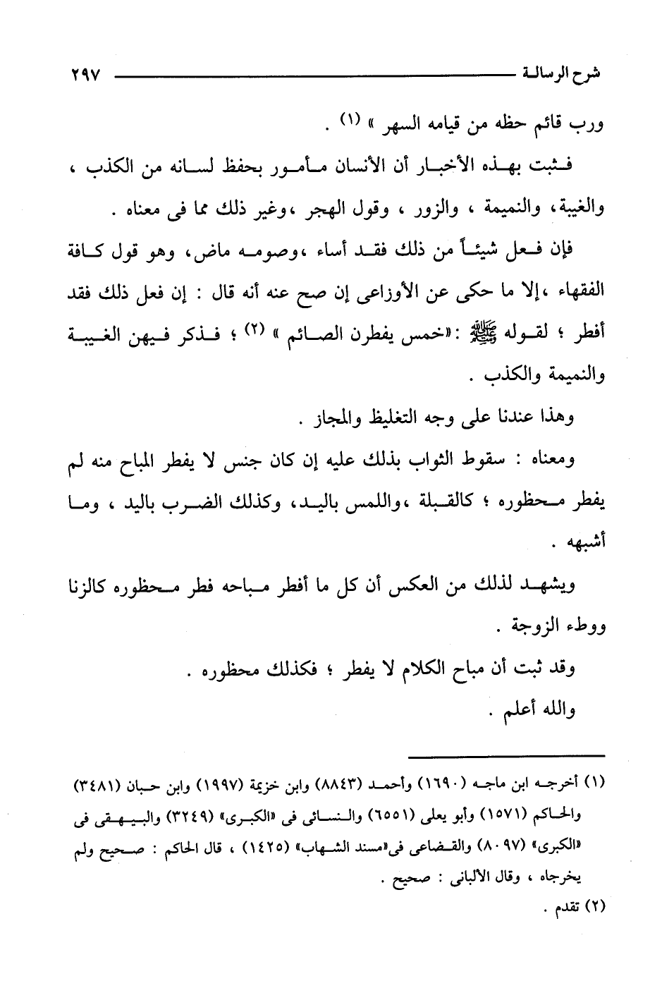 فإن فعل شيئا من ذلك فقد أساء، وصومه ماض، وهو قول كافة الفقهاء، إلا ما حكي عن الأوزاعي إن صح عنه أنه قال: إن فعل ذلك فقد أفطر؛ لقوله صلى الله عليه وسلم: "خمس يفطرن الصائم"؛ فذكر فيهن الغيبة والنميمة والكذب.