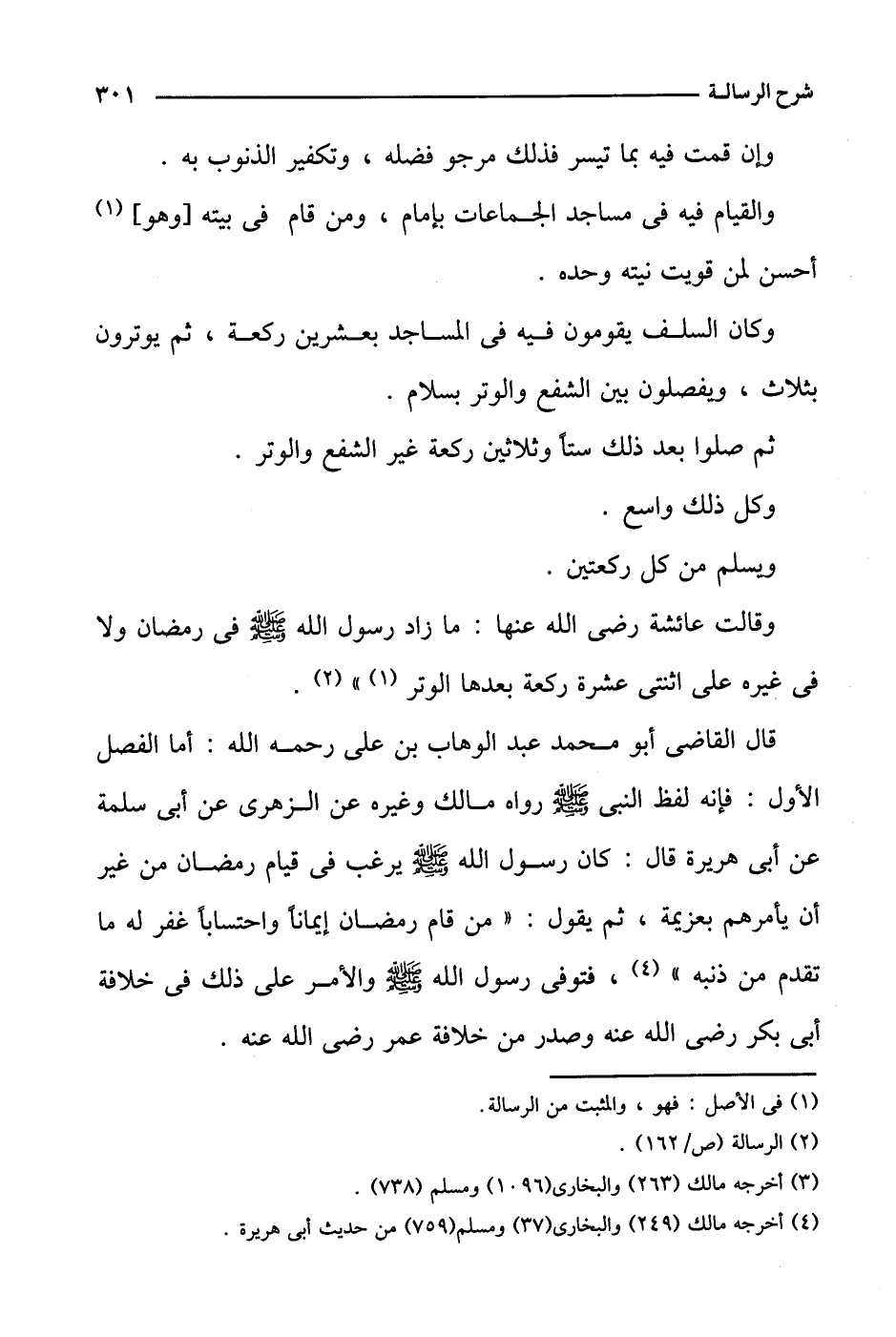 قال القاضي أبو محمد عبد الوهاب بن علي رحمه الله: أما الفصل الأول: فإنه لفظ النبي صلى الله عليه وسلم رواه مالك وغيره عن الزهري عن أبي سلمة عن أبي هريرة قال: كان رسول الله صلى الله عليه وسلم يرغب في قيام رمضان من غير أن يأمرهم بعزيمة، ثم يقول: "من قام رمضان إيمانا واحتسابا غفر له ما تقدم من ذنبه"، فتوفي رسول الله صلى الله عليه وسلم والأمر على ذلك في خلافة أبي بكر رضي الله عنه وصدر من خلافة عمر رضي الله عنه.