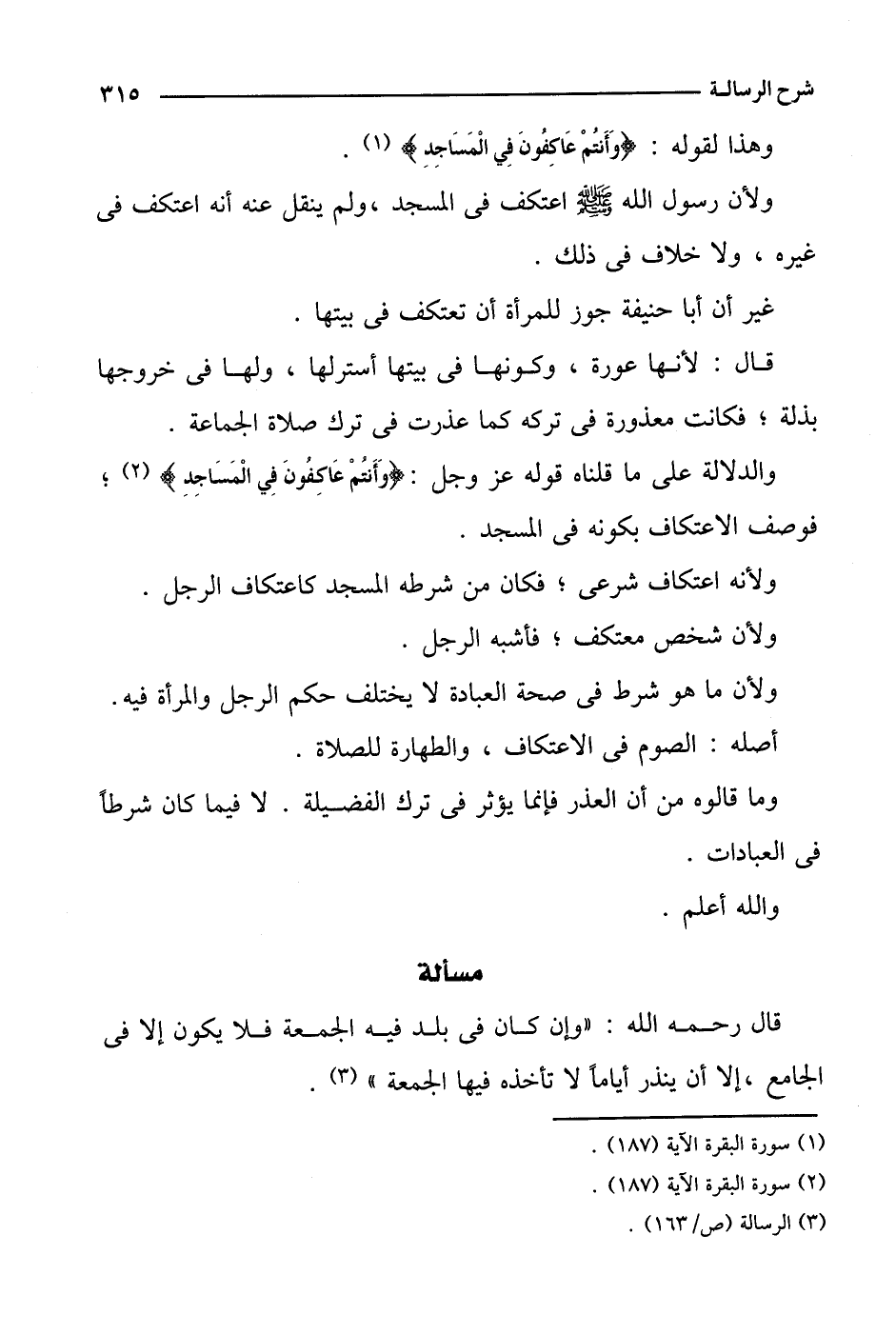 والدلالة على ما قلناه قوله عز وجل: {وأنتم عاكفون في المساجد}؛ فوصف الاعتكاف بكونه في المسجد.