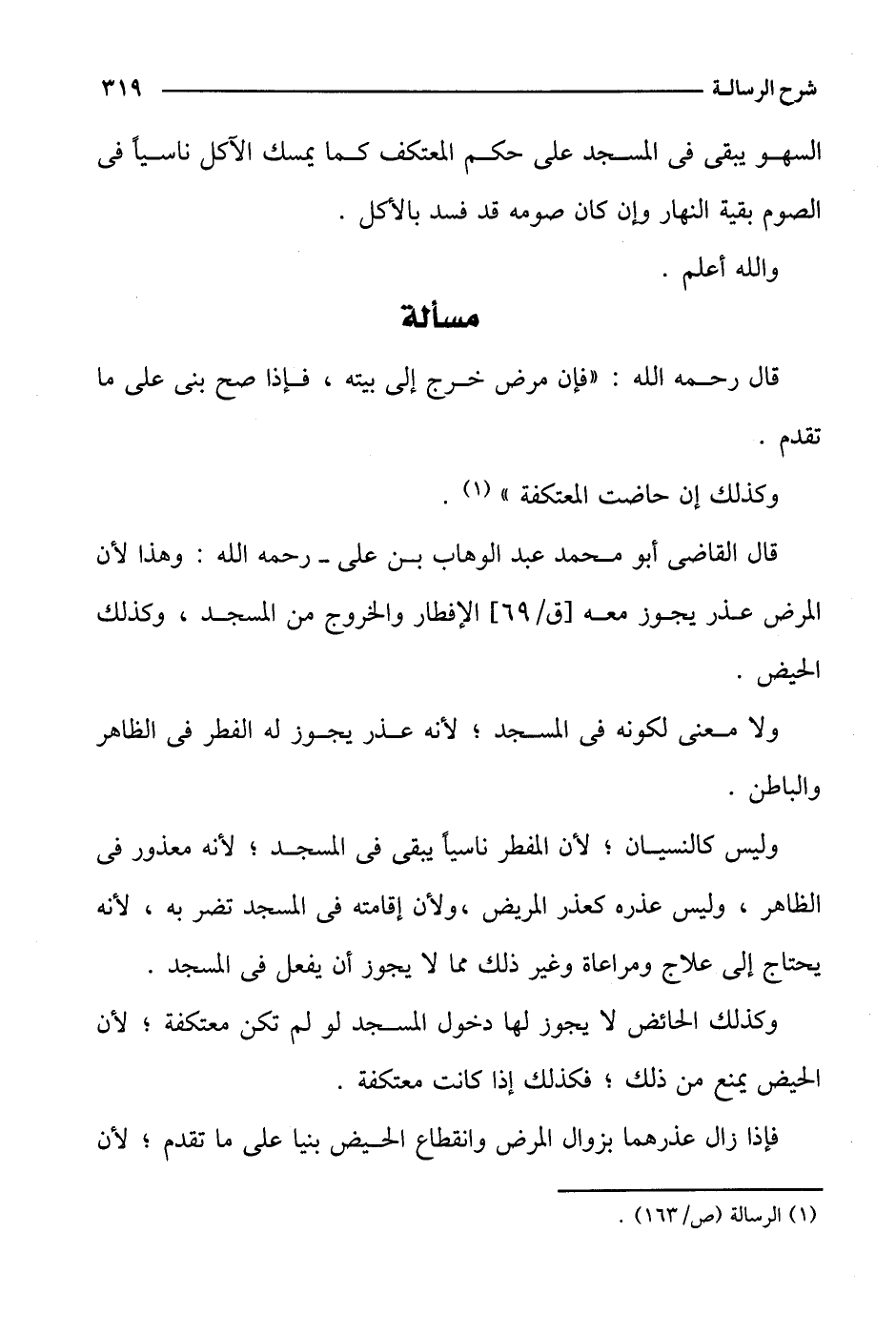 قال القاضي أبو محمد عبد الوهاب بن علي- رحمه الله: وهذا لأن المرض عذر يجوز معه [ق/69] الإفطار والخروج من المسجد، وكذلك الحيض.