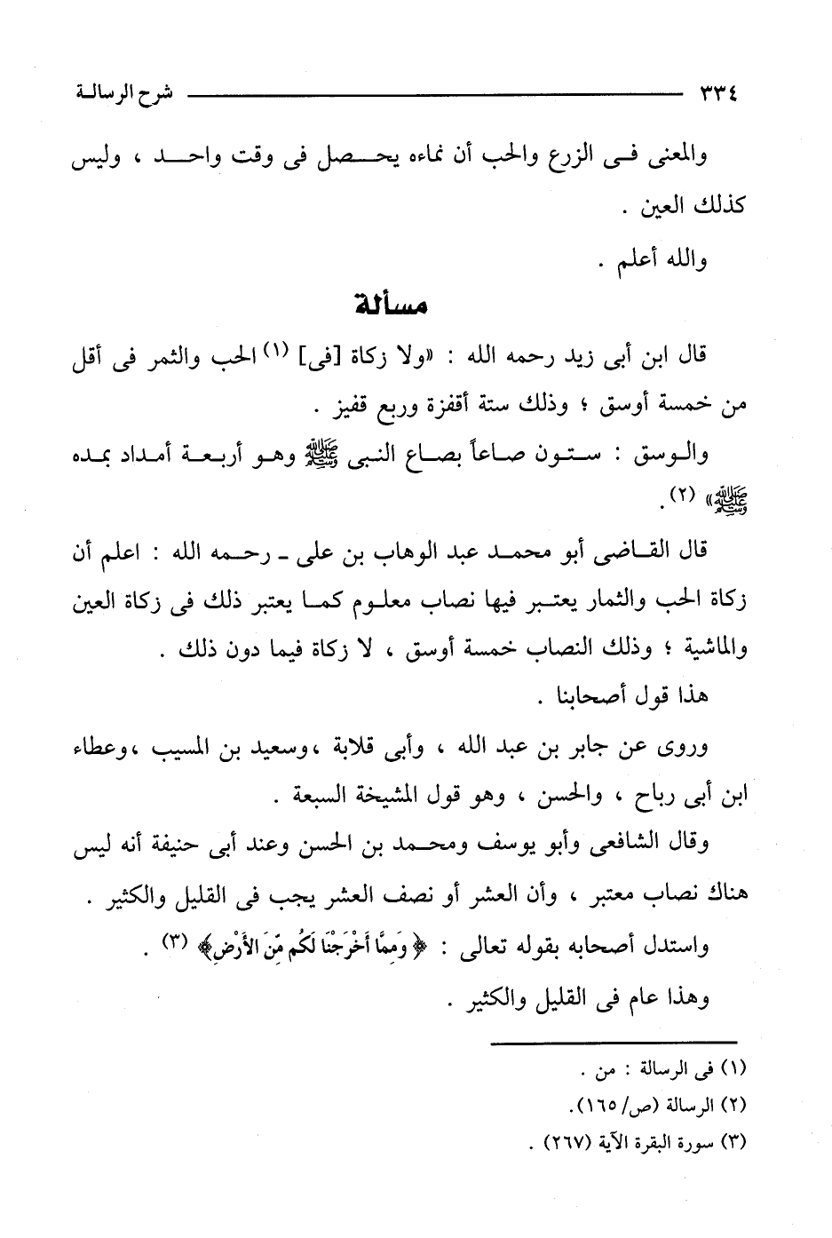 قال ابن أبي زيد رحمه الله: "ولا زكاة [في] الحب والثمر في أقل من خمسة أوسق؛ وذلك ستة أقفزة وربع قفيز.