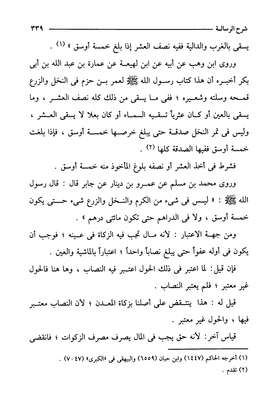 وروى محمد بن مسلم بن عمرو بن دينار عن جابر قال: قال رسول الله صلى الله عليه وسلم: "ليس في شيء من الكرم والنخل والزرع شيء حتى يكون خمسة أوسق، ولا في الدراهم حتى تكون مائتي درهم".