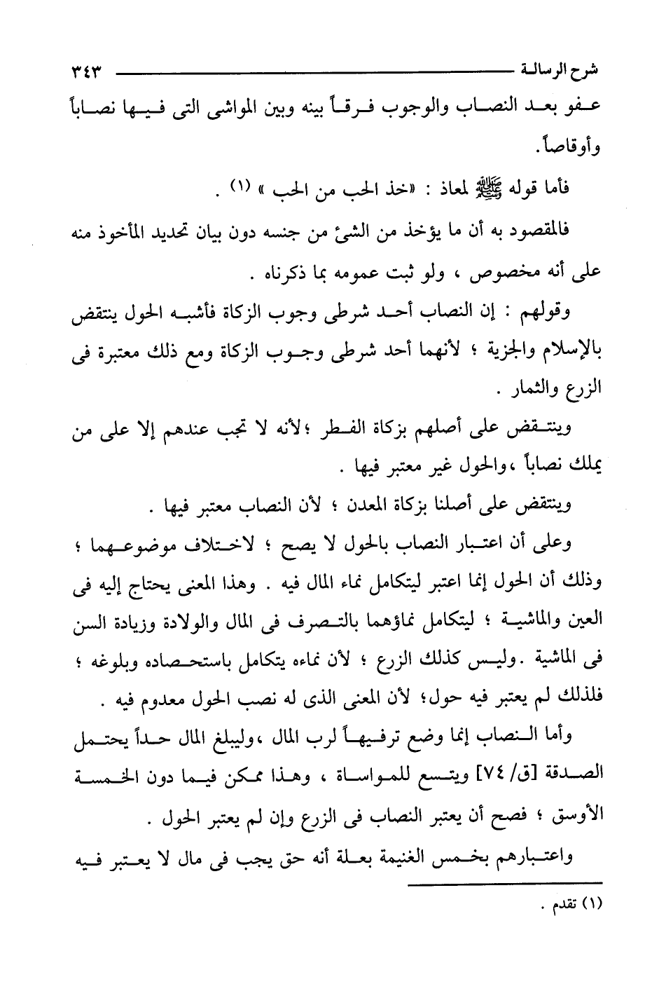 وعلى أن اعتبار النصاب بالحول لا يصح؛ لاختلاف موضوعهما؛ وذلك أن الحول إنما اعتبر ليتكامل نماء المال فيه. وهذا المعنى يحتاج إليه في العين والماشية؛ ليتكامل نماؤها بالتصرف في المال والولادة وزيادة السن في الماشية. وليس كذلك الزرع؛ لأن نماءه يتكامل باستحصاده وبلوغه؛ فلذلك لم يعتبر فيه حول؛ لأن المعنى الذي له نصب الحول معدوم فيه.