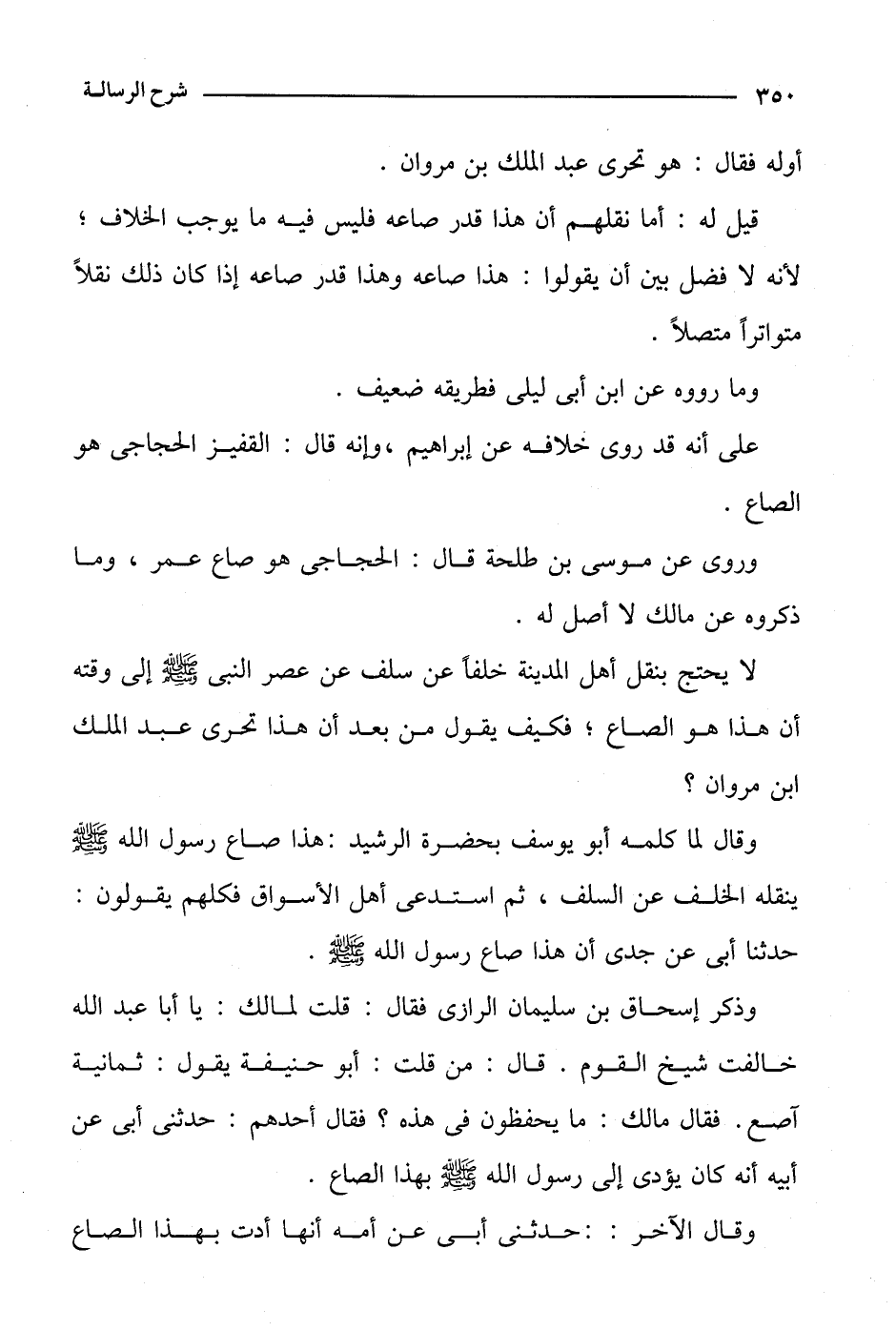 وقال لما كلمه أبو يوسف بحضرة الرشيد: هذا صاع رسول الله صلى الله عليه وسلم ينقله الخلف عن السلف، ثم استدعى أهل الأسواق فكلهم يقولون: حدثنا أبي عن جدي أن هذا صاع رسول الله صلى الله عليه وسلم.