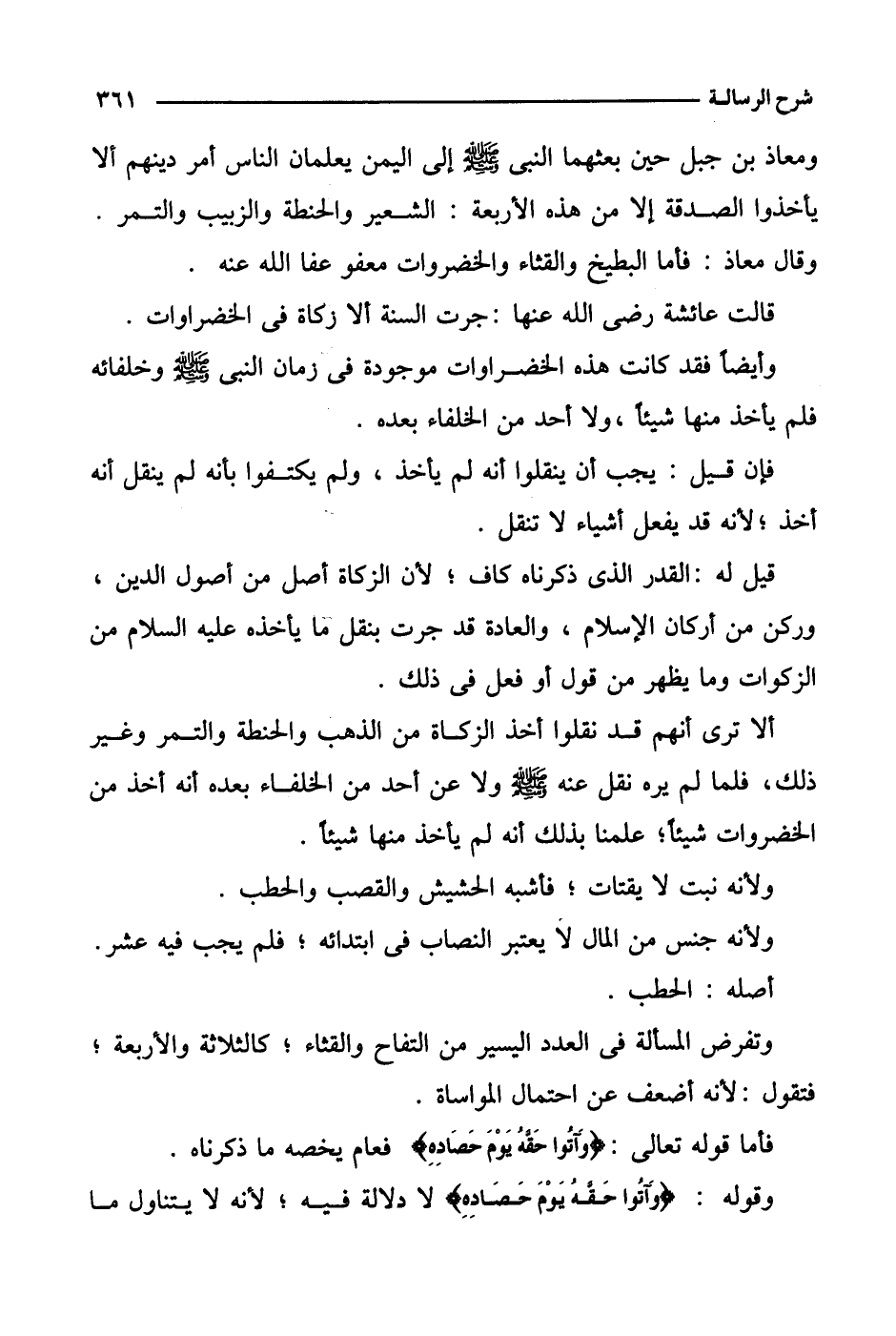 ومعاذ بن جبل حين بعثهما النبي صلى الله عليه وسلم إلى اليمن يعلمان الناس أمر دينهم ألا يأخذوا الصدقة إلا من هذه الأربعة: الشعير والحنطة والزبيب والتمر.