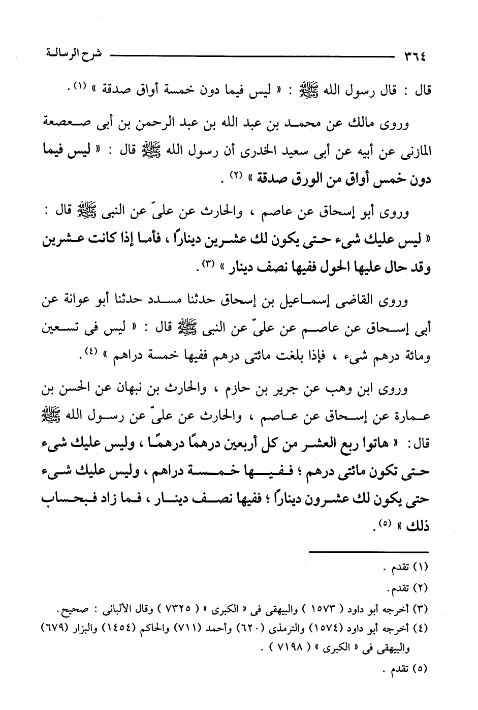 وروى القاضي إسماعيل بن إسحاق حدثنا مسدد حدثنا أبو عوانة عن أبي إسحاق عن عاصم عن علي عن النبي صلى الله عليه وسلم قال: "ليس في تسعين ومائة درهم شيء، فإذا بلغت مائتي درهم ففيها خمسة دراهم".