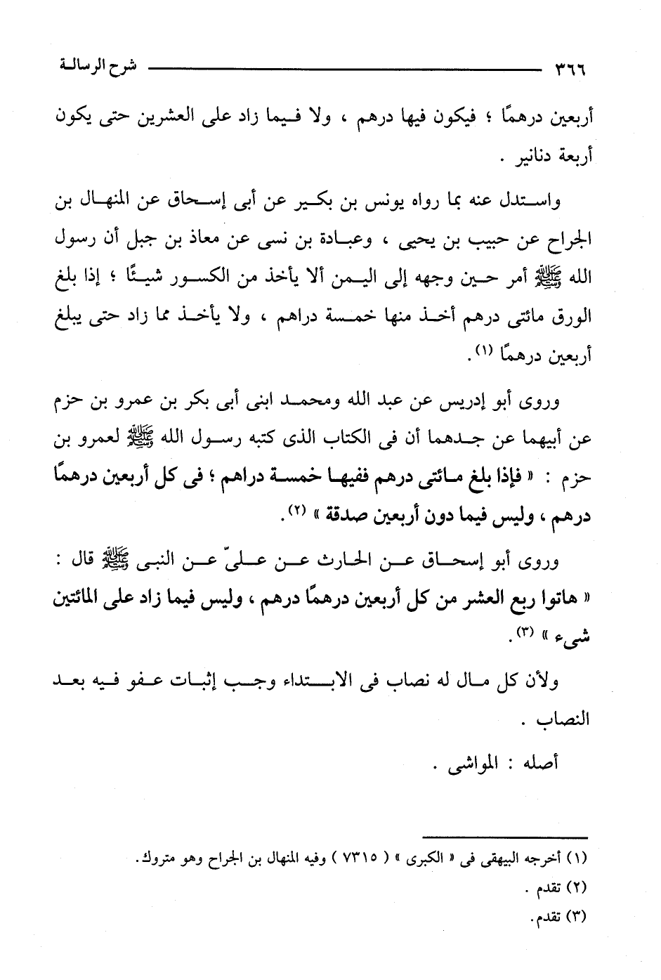وروى أبو إدريس عن عبد الله ومحمد ابني أبي بكر بن عمرو بن حزم عن أبيهما عن جدهما أن في الكتاب الذي كتبه رسول الله صلى الله عليه وسلم لعمرو بن حزم: "فإذا بلغ مائتي درهم ففيها خمسة دراهم؛ في كل أربعين درهما درهم، وليس فيما دون أربعين صدقة".